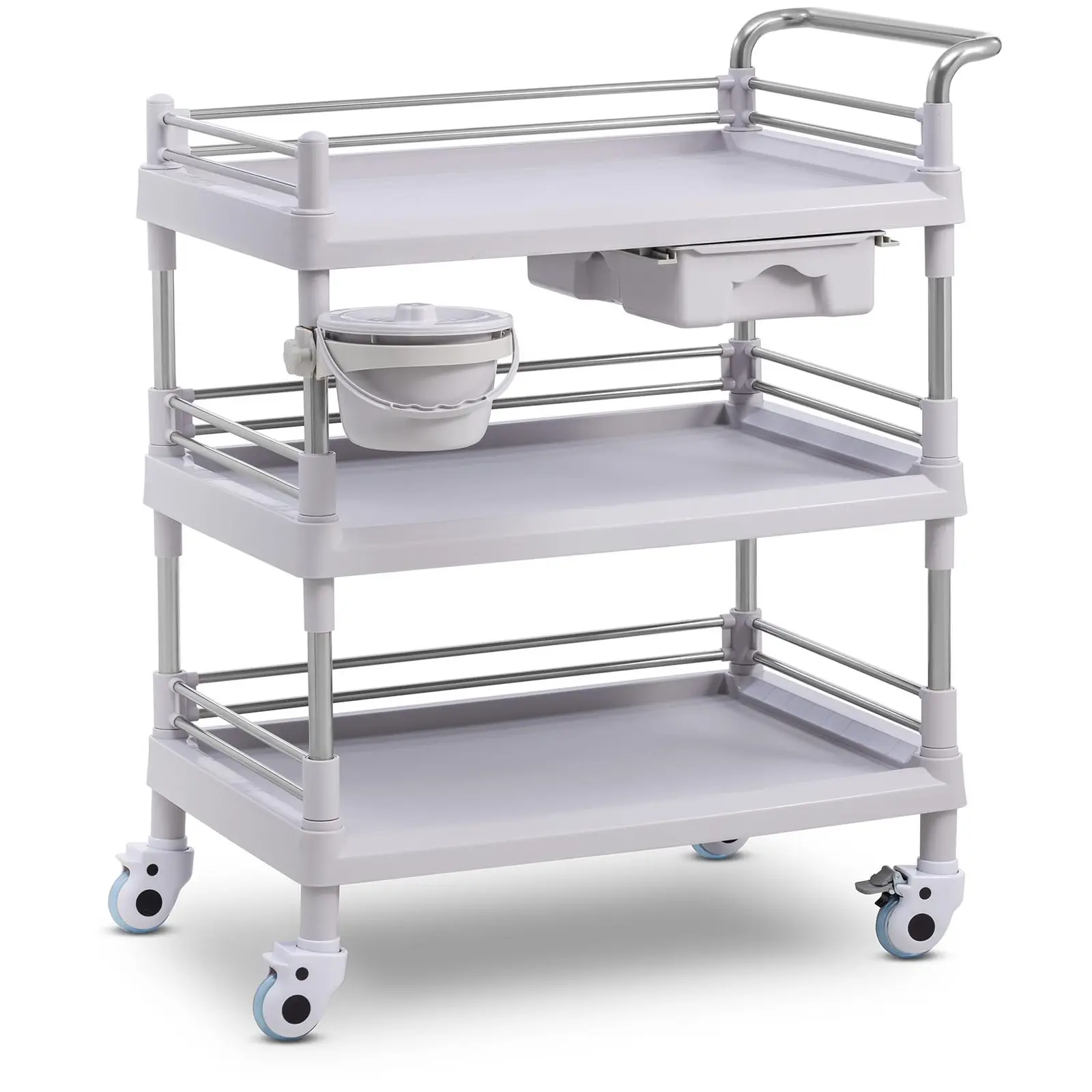 Pidätkö järjestyksestä ja haluat säilyttää tarvittavat välineet aina käden ulottuvilla? Tällöin tarvitset Steinberg Systemsin instrumenttivaunun! Vaunun kolmella tasolla ja yhdessä vetolaatikossa pidät välineet aina parhaassa järjestyksessä olipa kyseessä sitten koeputket nesteet tai käsipaperit. Käytä vaunun kolmea, mitoiltaan 65 x 46 x 14 cm olevaa tasoa välineiden säilyttämiseen käden ulottuvilla. Korotetut reunat estävät tavaroiden putoamisen tasoilta. Samalla yksi sivu on auki, mikä helpottaa välineiden ottamista vaunusta ja niiden lastaamista sinne. Lisää säilytystilaa tarjoaa mitoiltaan 18 x 35 x 8 cm vetolaatikko, jotka on sijoitettu mukavalle korkeudelle suoraan ylimmän säilytystason alapuolelle. Säilytätkö laitteita ja nesteitä kaapissa tai varastossa ja haluat siirtää ne kaikki nyt työpöydällesi? Tätä varten instrumenttivaunu tarjoaa reilusti tilaa ja kuljettaa kaikki tarvikkeet neljällä pyörällään ja työntökahvallaan nopeasti ja mukavasti juuri sinne, missä niitä tarvitset! Pyörien valmistusmateriaalina toimiva muoviseos (ABS + PVC) on erityisen hellävarainen myös herkille lattioille. Vaunun paikallaan pysyvyydestä huolehtii kaksi luotettavaa seisontajarrua. Laboratoriovaunu on varustettu jopa roskien varalle. Vaunun sivuun on kiinnitetty kätevä roskaämpäri, jonka voi tarvittaessa kääntää 360°. Vaunu vakuuttaa ruostumattomasta teräksestä valmistetulla, vankalla putkirakenteellaan ja muovisilla säilytystasoillaan, mikä mahdollistaa jopa 30 kg kuormitettavuuden. Kaikki valmistusmateriaalit ovat erittäin helppohoitoisia ja pitkäikäisiä, joten instrumenttivaunu ei petä edes päivittäisessä käytössä. Laboratorion lisäksi vaunu sopii myös lukuisiin eri käyttöympäristöihin, kun liikuteltava, mutta samalla hyvin järjestetty säilytystaso on tarpeen!