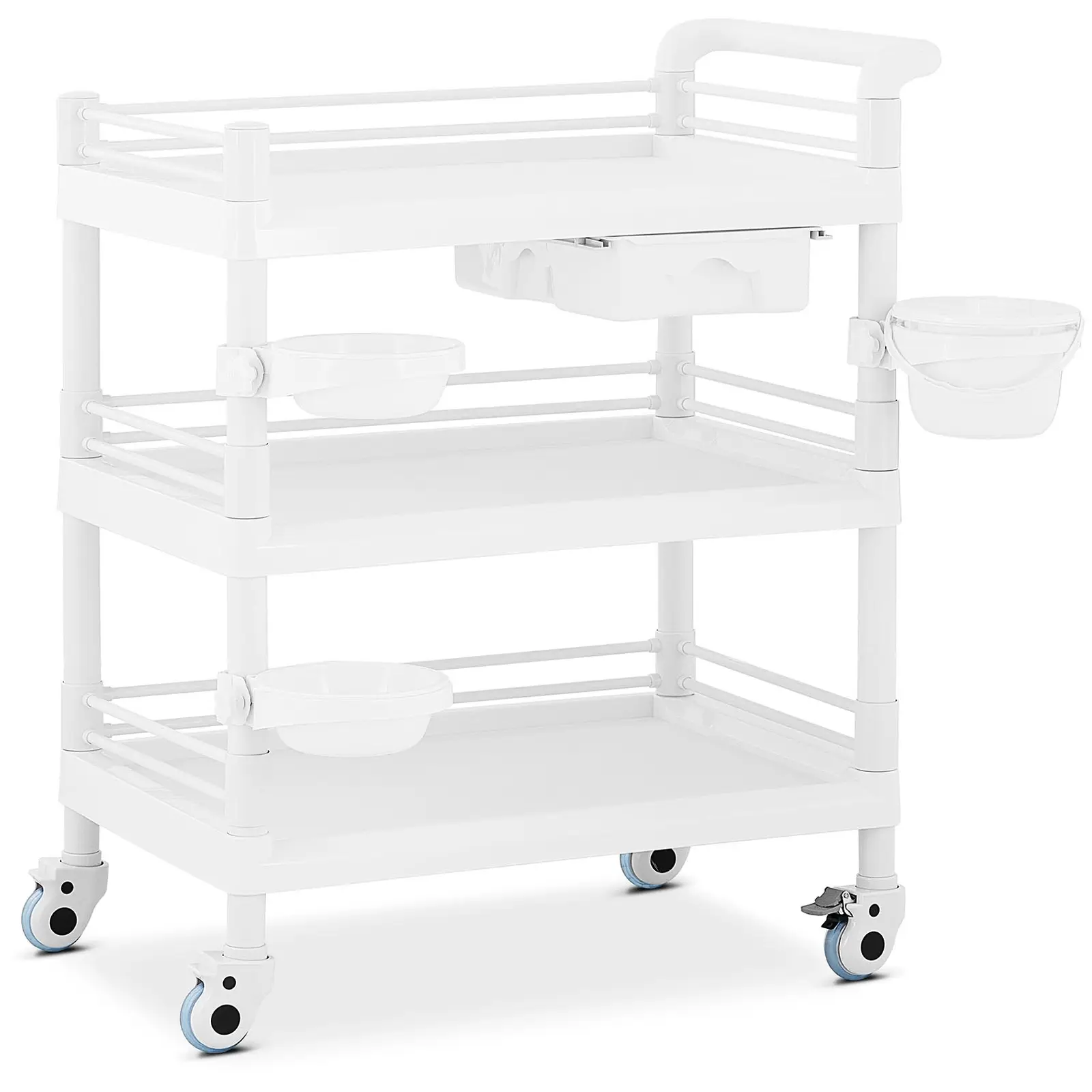 Pidätkö järjestyksestä ja haluat säilyttää tarvittavat välineet aina käden ulottuvilla? Tällöin tarvitset Steinberg Systemsin instrumenttivaunun! Vaunun kolmella tasolla ja vetolaatikossa pidät välineet aina parhaassa järjestyksessä olipa kyseessä sitten koeputket nesteet tai käsipaperit. Käytä vaunun kolmea, mitoiltaan 65 x 47 x 5 cm olevaa tasoa välineiden säilyttämiseen käden ulottuvilla. Korotetut reunat estävät tavaroiden putoamisen tasoilta. Samalla yksi sivu on auki, mikä helpottaa välineiden ottamista vaunusta ja niiden lastaamista sinne. Lisää säilytystilaa tarjoaa mitoiltaan 17 x 35 x 8 cm vetolaatikko, jotka on sijoitettu mukavalle korkeudelle suoraan ylimmän säilytystason alapuolelle. Laboratoriovaunu on varustettu jopa roskien varalle. Voit kiinnittää kolme kätevää astiaa (yksi kannellinen) haluamaasi kohtaan ja kääntää niitä tarvittaessa 360°. Säilytätkö laitteita ja nesteitä kaapissa tai varastossa ja haluat siirtää ne kaikki nyt työpöydällesi? Tätä varten instrumenttivaunu tarjoaa reilusti tilaa ja kuljettaa kaikki tarvikkeet neljällä pyörällään ja työntökahvallaan nopeasti ja mukavasti juuri sinne, missä niitä tarvitset! ABS:stä ja PVC:stä valmistettujen pyörien materiaaliyhdistelmä on erityisen hellävarainen jopa herkille lattioille. Vaunun paikallaan pysyvyydestä huolehtii kaksi luotettavaa seisontajarrua. Kestävästä muovista valmistettujen putkien ja hyllyjen ansiosta kuljetusvaunu tekee vaikutuksen vakaalla rakenteellaan, joka kantaa jopa 60 kg. Käytetyt materiaalit ovat erittäin helppohoitoisia ja kestäviä, joten laboratoriovaunu ei petä sinua päivittäisessäkään käytössä. Laboratorion lisäksi vaunu sopii myös lukuisiin eri käyttöympäristöihin, kun liikuteltava, mutta samalla hyvin järjestetty säilytystaso on tarpeen!