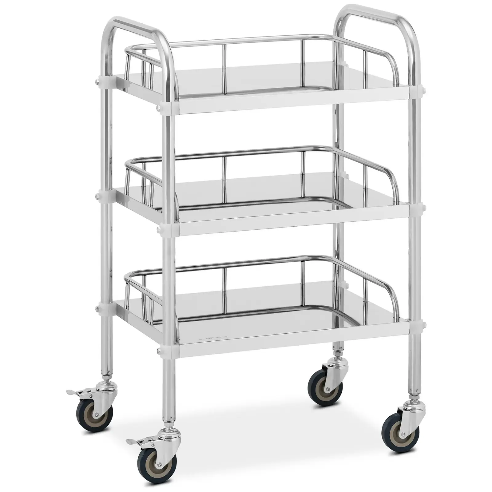 Pidätkö järjestyksestä ja haluat säilyttää tarvittavat välineet aina käden ulottuvilla? Tällöin tarvitset Steinberg Systemsin instrumenttivaunun! Vaunun kolmella tasolla pidät välineet aina parhaassa järjestyksessä olipa kyseessä sitten koeputket nesteet tai käsipaperit. Käytä vaunun kolmea, mitoiltaan 45 x 36 x 2,5 cm olevaa tasoa välineiden säilyttämiseen käden ulottuvilla. Korotetut reunat estävät tavaroiden putoamisen tasoilta. Samalla yksi sivu on auki, mikä helpottaa välineiden ottamista vaunusta ja niiden lastaamista sinne. Säilytätkö laitteita ja nesteitä kaapissa tai varastossa ja haluat siirtää ne kaikki nyt työpöydällesi? Tätä varten instrumenttivaunu tarjoaa reilusti tilaa ja kuljettaa kaikki tarvikkeet neljällä pyörällään ja kahdella työntökahvallaan nopeasti ja mukavasti juuri sinne, missä niitä tarvitset! Pyörien valmistusmateriaalina toimiva muovi (PVC) on erityisen hellävarainen myös herkille lattioille. Vaunun paikallaan pysyvyydestä huolehtii kaksi luotettavaa seisontajarrua. Laboratoriovaunun ruostumaton teräsrakenne kantaa jopa 15 kg ja tekee vaikutuksen vakaudellaan. Kaikki valmistusmateriaalit ovat erittäin helppohoitoisia ja pitkäikäisiä, joten instrumenttivaunu ei petä edes päivittäisessä käytössä. Laboratorion lisäksi vaunu sopii myös lukuisiin eri käyttöympäristöihin, kun liikuteltava, mutta samalla hyvin järjestetty säilytystaso on tarpeen!