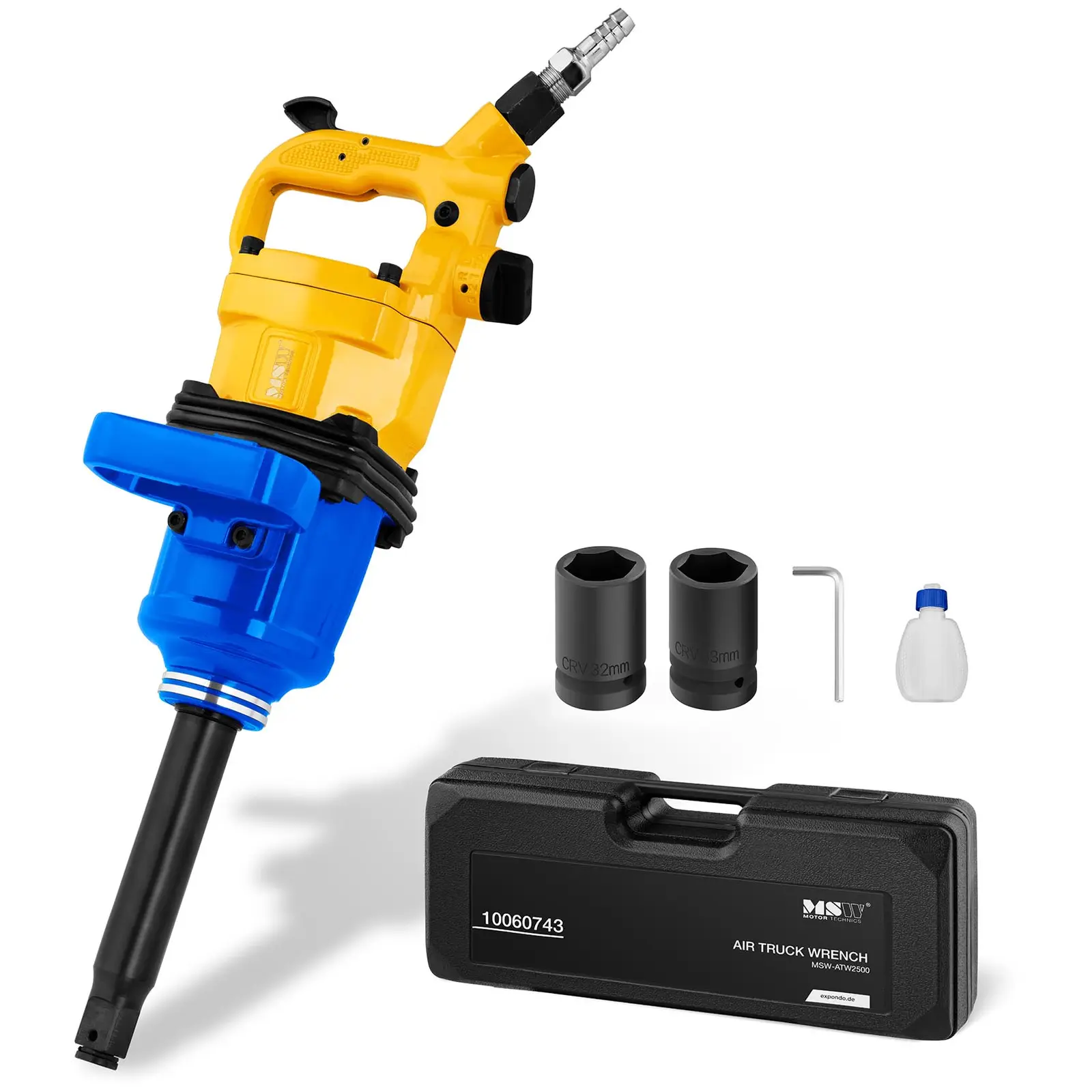 Rekoissa, traktoreissa ja linja-autoissa rakenneosat ja ruuvit ovat isompia ja täten vaikeammin irrotettavia kuin henkilöautoissa. MSW:n iskevä mutterinväännin MSW-ATW2500 tarjoaa sinulle tehokkaan työkalun, jolla ruuvaat isot ruuvit irti voimakkaasti ja luotettavasti. Täten tämä mutterinväännin on välttämätön apu korjaamoissa, linja-autojen huoltohalleissa sekä maatalousyrityksissä. Teollisuuslaatua oleva iskevä mutterinväännin työskentelee 2 500 Nm iskuteholla ja saa näin jokaisen ruuvin liikkumaan. Kiinteää kahvaa tukee 3 200 r/min oleva kierrosnopeus. Näin ruuvien irrottaminen sujuu vaivattomasti. Iskevä mutterinväännin on tehokkuudestaan huolimatta erittäin tasapainoinen. Sen kaksoisvasaramekanismi vähentää tärinää, minkä vuoksi myös pitkäaikainen työskentely onnistuu vaivattomasti. Laitteen pitkäikäisyyden takaamiseksi sen kotelo on valmistettu vankasta alumiinivalusta, joten jopa raskastyö sujuu laitteella turvallisesti. Ruuvinväännössä vääntösuunnan vaihdon lisäksi myös vääntötehokkuus voidaan valita pienen, keskisuuren ja voimakkaan väliltä helposti. Näin saavutat optimaalisen vääntötuloksen kohteesta riippumatta. Sujuvan työskentelyn takaamiseksi nopeuden ja vääntösuunnan säätimet on sijoitettu kätevään paikkaan. Paineilmatyökalu on varustettu ergonomisella, pehmustetulla kahvalla, jonka sivusta paineilma poistuu eikä se täten häiritse työskentelyä. Toisen sivulla sijaitsevan kahvan ansiosta voit ohjata konetta aina turvallisesti ja mukavasti ja kohdistaa sen tarkasti ruuviin. Vankka, 1 tuuman neliöasema turvaa optimaalisen voimansiirron ruuviavaimen hylsyyn. Mutterinvääntimeen kuuluva varustus toimitetaan kätevässä kantosalkussa. Saat ½ tuuman paineilma-adapterin, kaksi hylsyä (32, 33), kuusiokoloavaimen, neljä kahvaan kuuluvaa ruuvia, neljä jousta ja yhden öljyastian.