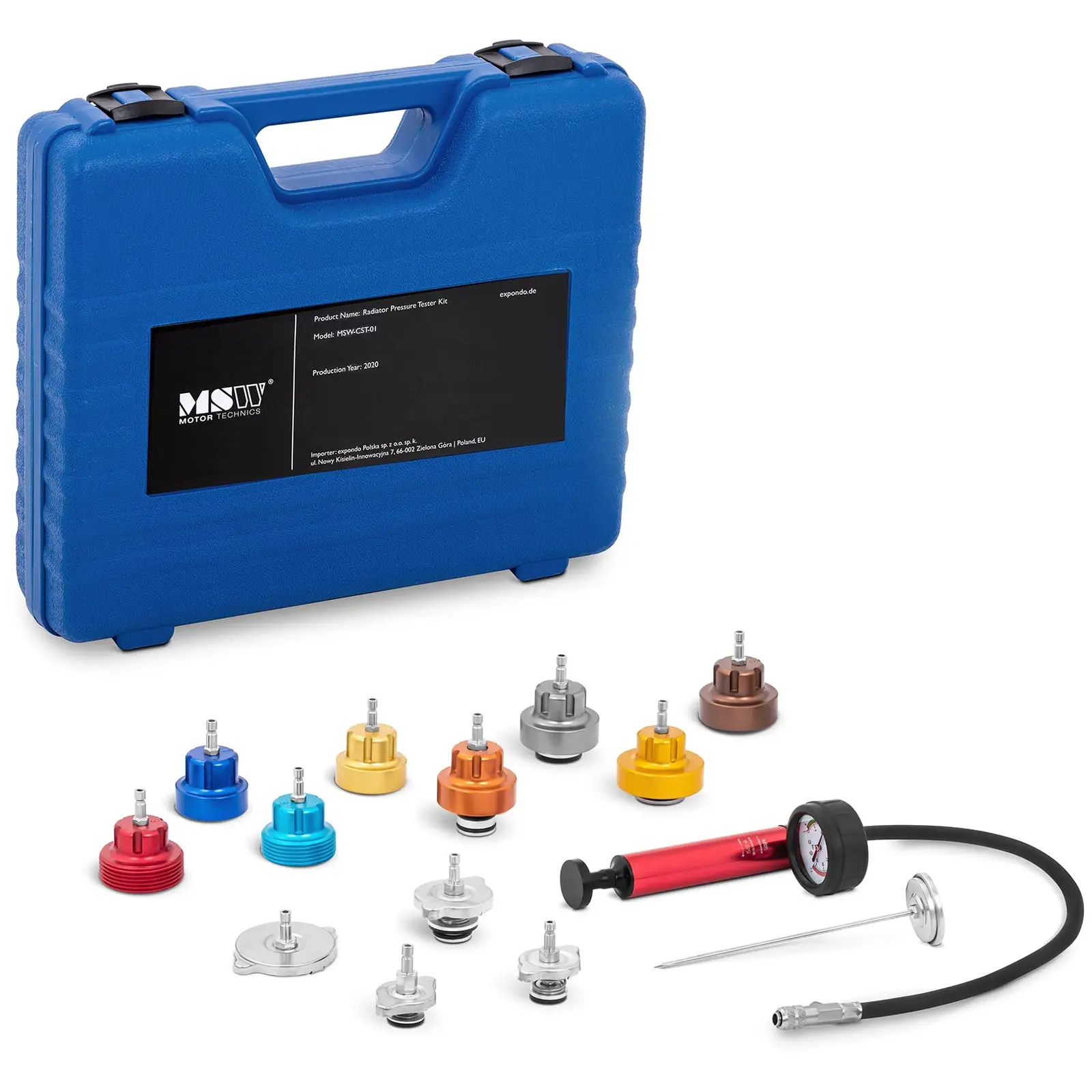 MSW:n ammattilaitteista löytyvä jäähdyttimen painetestaussarja löytää luotettavasti myös monimutkaisten jäähdytysjärjestelmien vuotokohdat. Yleiskäyttöinen adapterit sisältävä painetestaussarja sopii lähes kaikkien automerkkien jäähdyttimiin ja on täten ihanteellinen ammattimaiseen käyttöön autokorjaamoissa ja vianmääritykseen. Painetestaussarjan toimituksen sisältöön kuuluu 12 adapteria jäähdyttimille, joita löytyy lähes kaiken merkkisistä ja mallisista ajoneuvoista, joten jäähdyttimen painetestaussarja on yleiskäyttöinen. Adapterit jäähdytyssäiliölle on merkitty erivärein, jotta ne voidaan yhdistää nopeasti ja ongelmattomasti haluttuun ajoneuvotyyppiin. Painetestaussarjassa on 0 – 2,5 baarin mittausalue sekä sivussa sijaitseva, intuitiivisesti käytettävä paineentasausventtiili. Itse testauksessa jäähdytysjärjestelmään aiheutetaan ylipaine käsipumpun avulla. Vuototapauksessa näytöstä on luettavissa pienen ajan kuluessa paineenmenetys. Värikoodattu manometri mahdollistaa jäähdyttimen asianmukaisen ja helpon testauksen. Laitteen valmistuksessa käytettyjen laadukkaiden materiaalien ansiosta painetestaussarja on erittäin pitkäikäinen. Kevyt säilytyssalkku mahdollistaa helpon kuljetuksen ja ongelmattoman säilytyksen, kun laitetta ei tarvita. Jäähdyttimen painetestaussarjan lisäksi salkkuun mahtuu kaikki adapterit selkeään järjestykseen sekä lisävarusteena toimitettava neulalämpömittari.