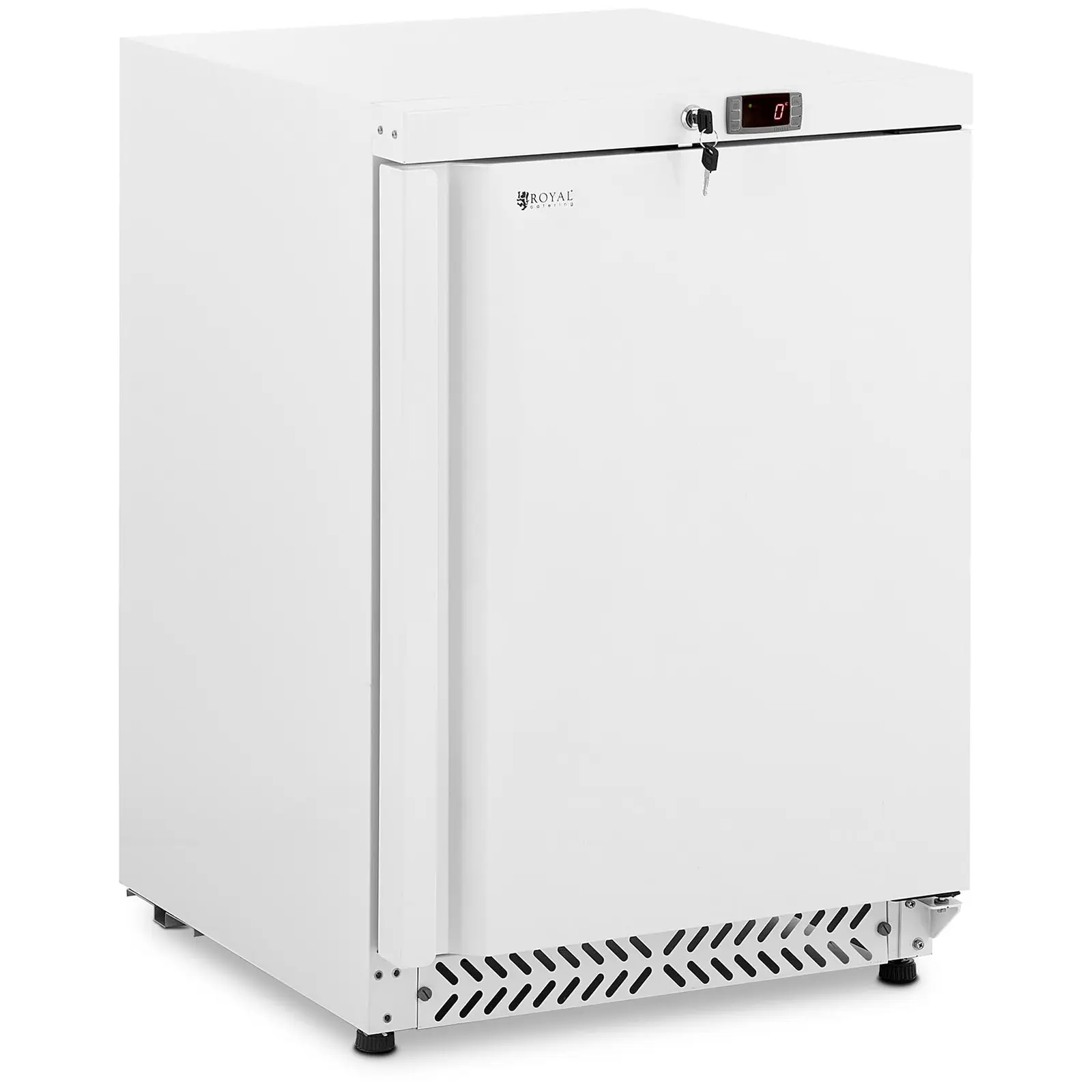 Monet elintarvikkeet pysyvät todella tuoreina ja maukkaina vain kylmälaitteiden avulla. Royal Cateringin jääkaappi tarjoaa runsaasti tilaa kylmien tuotteiden säilytykseen, myös suurelle asiakasmäärälle. Ei ole väliä, onko kyse tuoreista vihanneksista, valmisruuista, kastikkeista, juomista, keitoista tai maitotuotteista, jääkaappi säilyttää kaiken luotettavasti kylmänä ja juuri niin, että voit käsitellä sitä mitä parhaiten. Jääkaapin tilavuus on 170 l. Sisätilojen optimaaliseen hyödyntämiseen on käytettävissä hyllyä kolme, joista jokainen kantaa 30 kg. Digitaalinen termostaatti ylläpitää tarkasti jäähdytyslämpötilaa, jonka voit säätää 0 – 8 °C välille ohjauspaneelin kautta. Näin voit mukauttaa lämpötilan optimaalisesti säilytettävän ruuan mukaan. Pakastin jäähdytetään kylmäaineella R600a, jolla on erinomaiset termodynaamiset ominaisuudet ja joka tekee vaikutuksen korkealla energiatehokkuudellaan. Lisäksi ympäristöystävällinen kylmäaine ei vaikuta negatiivisesti otsonikerrokseen tai kasvihuoneilmiöön. 187 W kompressorin avulla jääkaappi saavuttaa nopeasti halutun lämpötilan. Pienen tilavuutensa lisäksi kompressori tekee vaikutuksen pitkäikäisyydellään. Laadukas kotelo, sisäosa ja vakaa saranaovi on valmistettu teräksestä. Materiaalille on ominaista korkea kestävyys ja pitkäikäisyys. Sileät pinnat voidaan helposti puhdistaa, eivätkä ne ole herkkiä ulkoisille vaikutuksille. Vapaasti seisovana jääkaappina tämä malli on tukeva ja vakaa 30 mm korkeudesta säädettävillä jaloillaan.