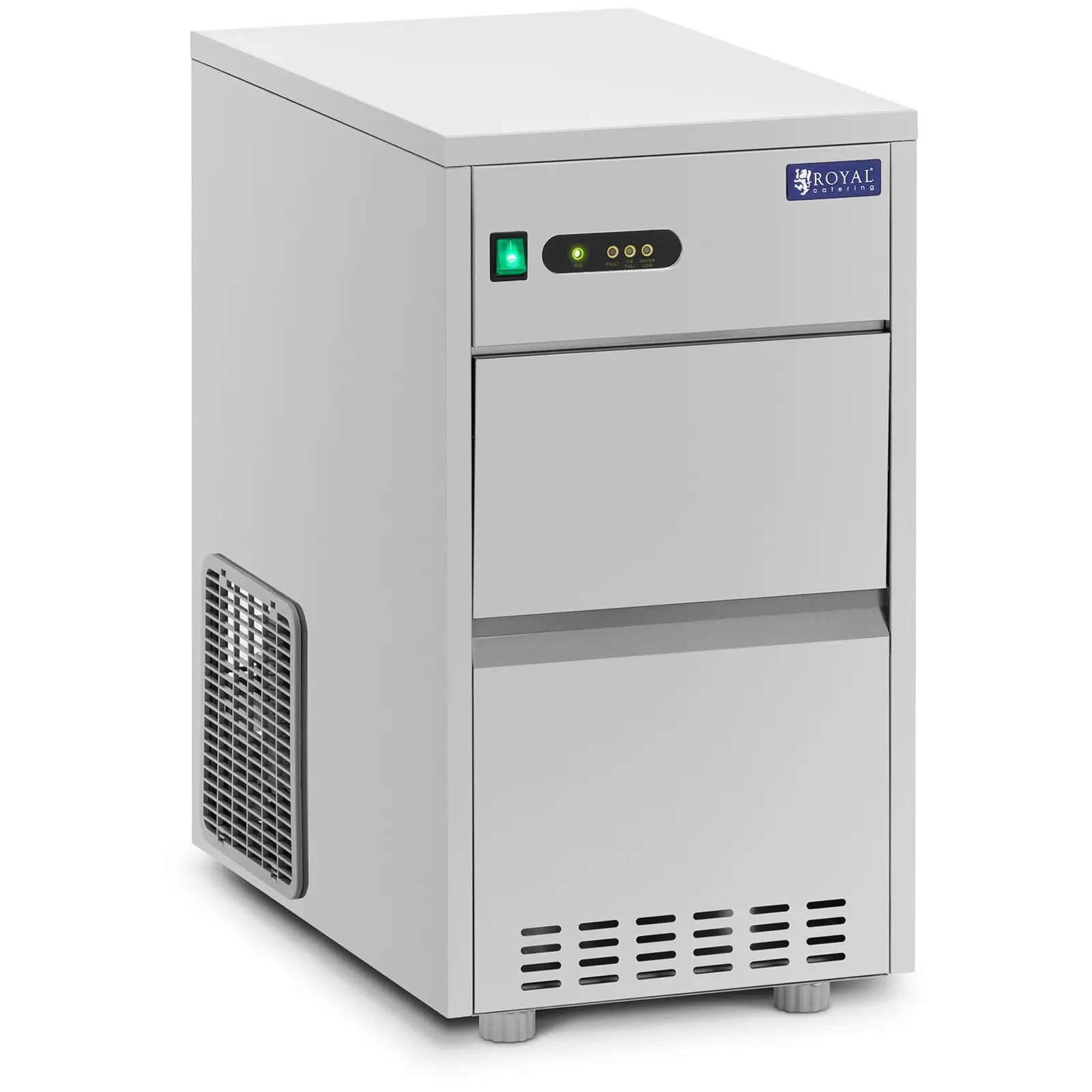 Royal Cateringin jääpalakone: eivätkä kylmät juomat lopu kesken. Tämä ammattikäyttöön tarkoitettu laite tuottaa 165 W tehollaan 20 kg/24 h jääkuutiota. Näin kone tuottaa toimintysykliä kohden 16 jääpalaa, joiden koko on Ø 28 x 40 mm. Kokonaan ruostumattomasta teräksestä valmistettu jääpalakone on hitti baareissa, ravintoloissa ja kaikkialla, missä tarjoilet kylmiä virvokkeita. Jääpalakone ammattikäyttöön tarjoaa nopeutta ja tehokkuutta ravintoloiden vaativiin tarpeisiin. Jääpalakoneessa on suuri 5 kg:n kapasiteetti ja sen käyttö on intuitiivista. Voit ohjata jääpalakoneen toimintoja selkeän ohjauspaneelin avulla. Toimitukseen sisältyy myös kauha jääpalojen annostelemiseen. Tyylikkäästä ruostumattomasta teräksestä valmistettu jääpalakone ei ihastuta vain visuaalisella ilmeellään. Myös koneen materiaali tekee vaikutuksen. Se kestää hyvin ulkoisia vaikutuksia ja korroosiota. Lisäksi se on elintarvikekäytössä erittäin hygieeninen. Myös koneen muotoilu on tarkan suunnittelun tulos: sivuseinien tuuletusaukot ja ilmanpoisto laitteen takana pitävät huoneilman raikkaana ja viileänä keittiössä, baaritiskillä ja asiakastiloissa. Muotoilu ehkäisee lämpimän poistoilman kulkeutumisen koneen ympäristöön. Jääpalakone on miellyttävän hiljainen ja pitää käytössä vain 55 dB ääntä.