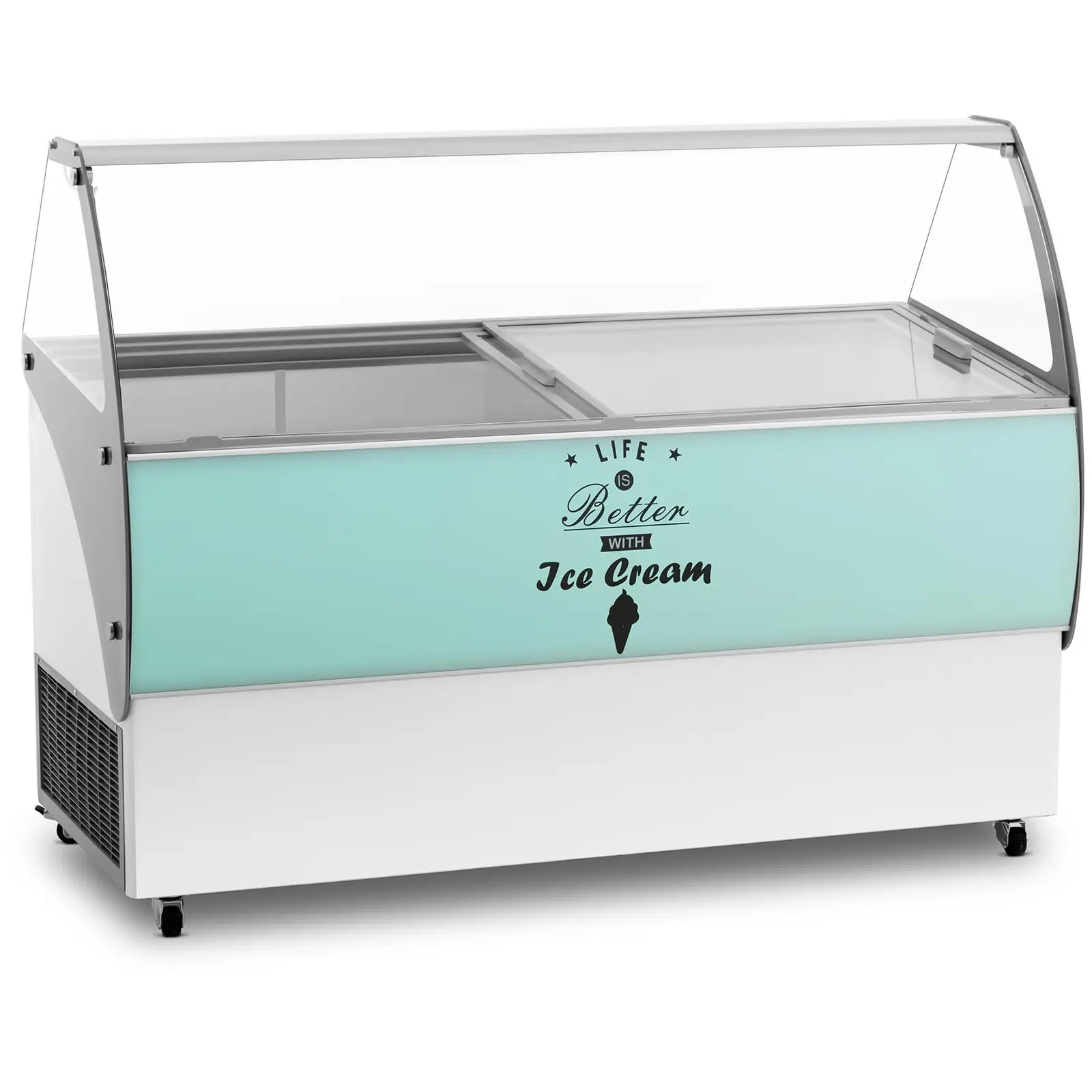 Tee omasta ja asiakkaidesi päivästä makeampi! Crystalin jäätelövitriinillä viilennät ja tarjoilet monia erilaisia jäätelöitä. Tyylikäs jäätelövitriini houkuttelee näyttävän tiskin ja LED-valaistuksen ansiosta kaikki makeanhimoiset paikalle. 540 litran jäätelövitriinissä on tilaa jopa 14 muoviselle tai 13 ruostumattomasta teräksestä valmistetulle jäätelöastialle. Suuren näyteikkunan ansiosta esittelet jäätelösi tyylikkäästi ja suojaat niitä samanaikaisesti lialta. Lasi on karkaistu, iskunkestävä ja vähentää siten loukkaantumisriskiä. Kirkkaan LED-valaistuksen ansiosta pidät jäätelöt aina näyttävästi esillä. Jäätelötiskissä on tarjoilutaso, jonka avulla palvelet asiakkaitasi kätevästi. Kohokohta: vitriinissä on tiskiallas jäätelökauhojasi varten. Näin voit pitää jäätelökauhasi puhtaana ilman, että sinun tarvitsee vaihtaa paikkaa jatkuvasti. Tästä huolimatta jäätelövitriini on helposti liikuteltava myös ravintolaympäristössä. Voit työntää laitteen helposti haluamaasi paikkaan neljän kestävän pyörän avulla. Lisäksi se on helppo siirtää pois tieltä työtilojen siivouksen ajaksi. Tilavan jäätelötiskin säilytystilassa voit pitää muita laitteita. Myös tiskin takana sijaitseva ovi antaa sinulle lisää säilytystilaa. Laiteessa on 242 W tehoinen kompressori, jonka ansiosta se saavuttaa nopeasti halutun käyttölämpötilan. Laitteen lämpötilan säätöalue -22 … -15 °C takaa, että jäätelösi pysyvät luotettavasti kylmänä.