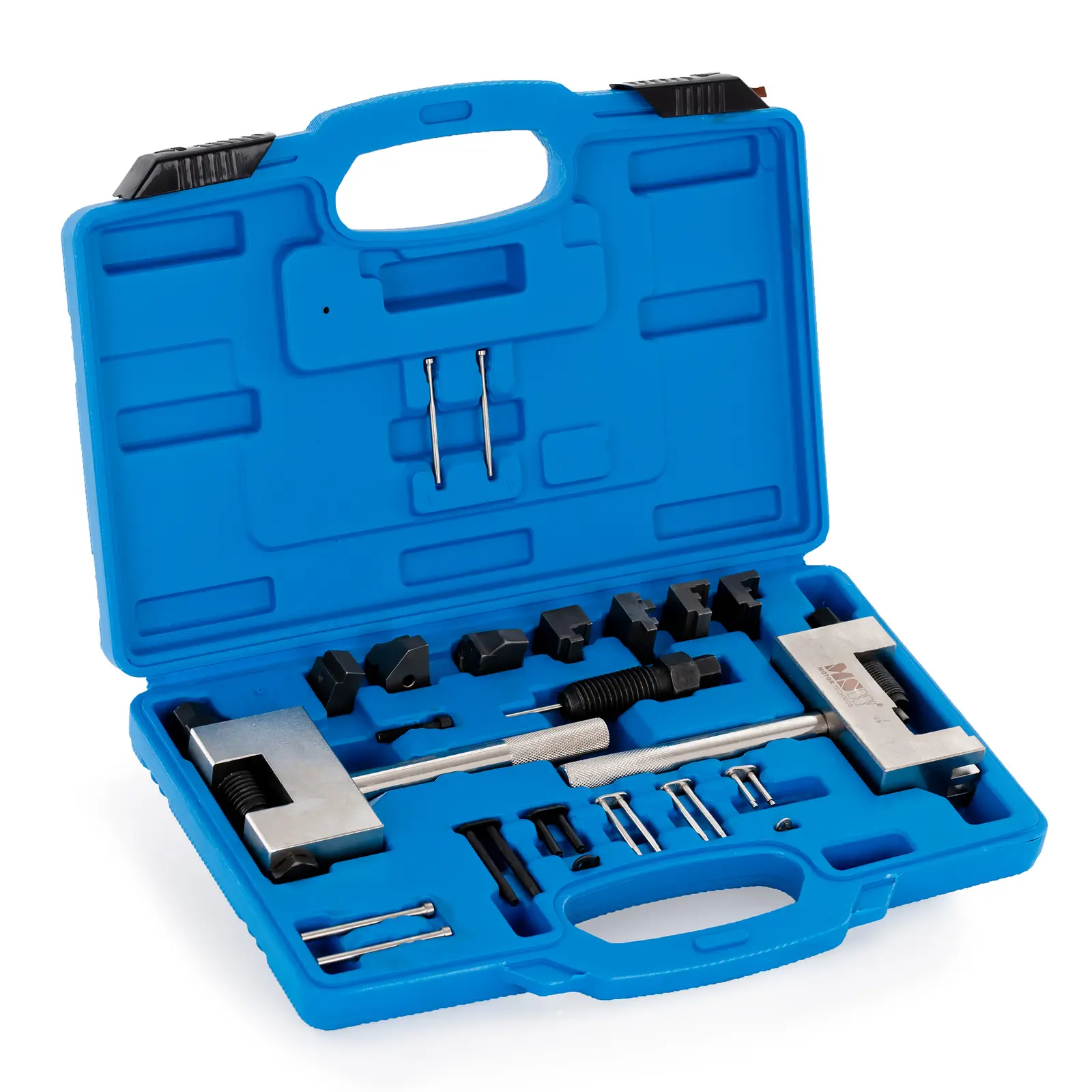 Moottoreiden huoltoon ja korjaamiseen MSW tarjoaa korkealaatuisia autotyökaluja, joilla voit täyttää yksittäisten moottorielementtien erityisvaatimukset. MSW: n jakoketjun niittaustyökalu MSW-ETT24 sisältää kaiken niin, että jakoketju pyörii kampiakselista nokka-akseliin uudelleen luotettavasti. Laaja työkalusarja soveltuu Mercedes-Benz -dieselmoottoreille, joiden tilavuus on 1,7 – 4,0 l. Sitä voidaan käyttää myös joissakin Chrysler – ja Jeep -malleissa. Näin niittaustyökalu on käytössä erittäin joustava. Työskentely muiden kaupallisesti saatavien työkalujen kanssa voi vahingoittaa moottorinosia tai johtaa jopa käyttäjän loukkaantumiseen. Lisäksi MSW: n työkalusarja varmistaa, ettei kulumisia juuri synny. Käytä moottorin ajoitustyökalua korvaamaan, erottamaan ja niittamaan duplex-ajoketjut 4 mm: n ketjupultilla. Vanha jakoketju voidaan vetää sisään uudella ketjulla. Koska ketjukoteloa ei tarvitse purkaa usein, jakoketjun uusiminen on paljon helpompaa ja työskentelet säästeliäästi, ettei kulumia pääse juuri syntymään. Vankasta ja kestävästä teräksestä valmistetut työkalut tarjoavat sinulle monen vuoden uskollisen palvelun, eikä niiden siksi pitäisi puuttua mistään ammattiautokorjaamosta tai kunnianhimoisesta harrastelijamekaanikon autotallista! Asiakaskäynneillä voit säilyttää kaikki osat puhtaasti ja turvallisesti tukevassa muovisessa kuljetuslaukussa, jossa jokaisella osalle on oma paikkansa. Näin sinulla on aina työkalut järjestyksessä ja kaikki on saatavilla heti, kun työkaluja tarvitaan.