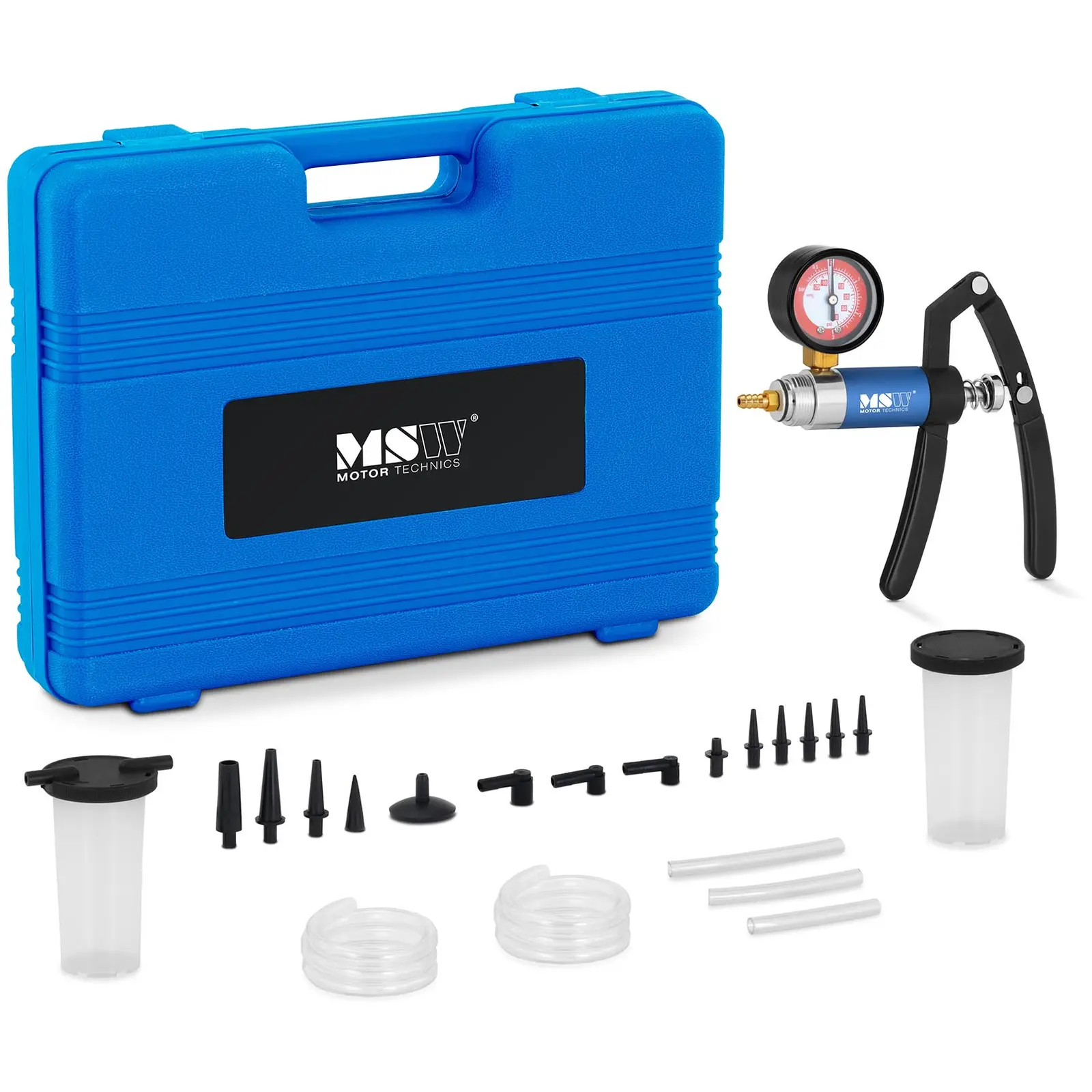 MSW-BRM-11 -jarrujen ilmauslaite on monipuolinen ja käsikäyttöinen alipainepumppu. Pneumaattisten ja hydraulisten järjestelmien asetukset ja toiminnot voidaan tarkistaa ilmanpoiston ja jarrunesteen vaihdon lisäksi laajan lisävarustevalikoiman ansiosta. MSW: n ajoneuvotyökalu sopii lähes kaikenlaisille ajoneuvoille, joten sen ei tulisi puuttua yhdestäkään autokorjaamosta. Jarrun ilmauslaitteella jarruletkut voidaan tarkistaa nopeasti ja helposti, ja tarvittaessa jarrunestettä voidaan suoraan lisätä tai se voidaan vaihtaa. Tarvittava jarrujen ilmaaminen on myös mahdollista tällä monipuolisella työkalusarjalla. Käsikäyttöinen alipainetestauslaite ei sovellu pelkästään ilmauslaitteeksi. Periaatteessa yleistyökalua voi käyttää lisäksi paine- ja alipainejärjestelmien testaamiseen, mikä helpottaa vianetsintää. Lukuisten liitäntävaihtoehtojen lisäksi suuri ja helposti luettava kaksoisasteikolla varustettu manometri takaa monipuolisen ja mutkattoman käytön. Painetesteri toimii erittäin tarkasti -2,07 – 2,76 bar:n mittausalueella. Laajan lisävarustevalikoiman ansiosta laitetta voidaan käyttää kaikkien yleisten ajoneuvotyyppien kanssa. Lukuisat lisäosat ja adapterit takaavat laajat käyttömahdollisuudet. Intuitiivisen pikaliitännän ansiosta laite on välittömästi käyttövalmis ja sen avulla löydät ongelmalähteet nopeasti. Jarrujen ilmauslaite toimitetaan käytännöllisessä säilytyssalkussa, mikä tekee laitteesta ihanteellisen myös liikkuvaan käyttöön, ja mahdollistaa lisäksi sen nopean ja hallitun säilytyksen.