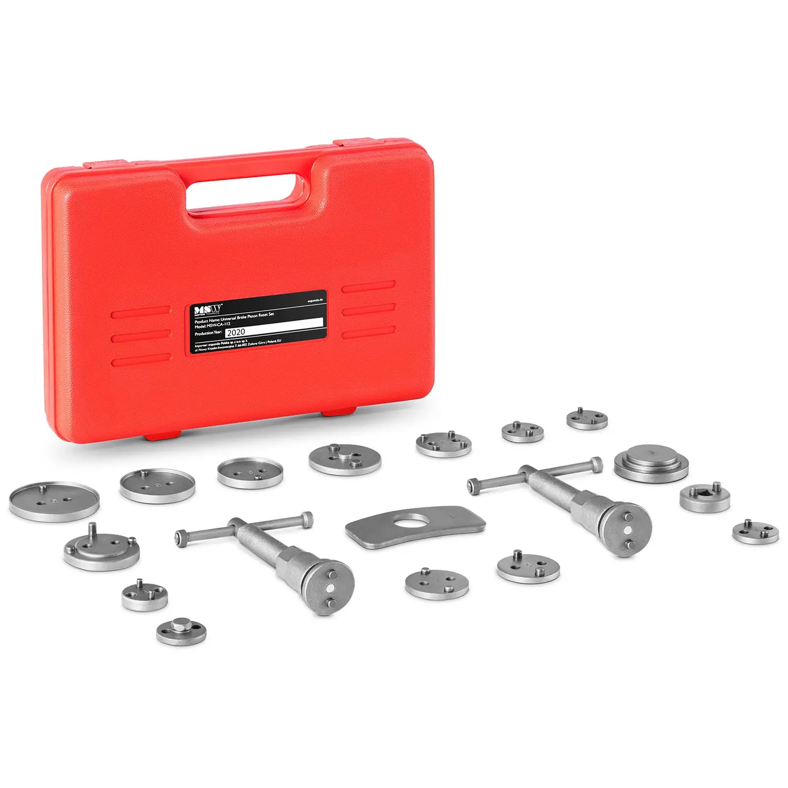 Jarrumännän palautuslaite MSW-CA-112 on ammattimainen työkalusarja eri automerkkien jarrumäntien sisään painamiseen. Tämän työkalusarjan avulla voidaan käsitellä sekä etu- että takapyörän jarruja. Kaksi kierteitettyä karaa ja eri sovittimet mahdollistavat vaivattoman työskentelyn erilaisten jarrumallien parissa. Autotyökalu sopii yhtä hyvin niin ammattikorjaamoihin kuin innokkaille autoharrastajillekin. Jarrusatulan mäntien palautustyökalu tarjoaa useita erilaisia sovittimia, joita voidaan käyttää kaikissa yleisissä jarrumalleissa niiden eri muotojen ja kokojen vuoksi. 15 sovitinta on merkitty kirjaimilla ja numeroilla, jotta löydät helposti etsimäsi osan ajoneuvoon. Kummankin pyörivän karan T-kahvat takaavat vahvan ja luotettavan yhteyden sovittimiin käytön aikana. Työkalusarja sisältää sekä oikealle että vasemmalle kääntyvän kierrekaran – käyttöalueesta ja henkilökohtaisesta työskentelytavasta riippuen. Molemmat työkalun kierrekarat on varustettu käytännöllisellä T-kahvalla, jonka avulla syntyvä voima välittyy jarrumäntiin – vastaava mäntä voidaan siten palauttaa vaivattomasti. Kaikki tämän sarjan työkaluelementit on valmistettu hiiliteräksestä, joten ne ovat ihanteellisia ajoneuvojen jarrujen parissa voimaa vaativaan työskentelyyn. Materiaali on erittäin vankkaa ja kestävää, eikä rikkoudu herkästi. Yksittäiset työkalun osat pysyvät siten lähes ikuisesti ehjinä ja takaavat pitkän käyttöiän sekä kestävyyden. Koko työkalusarja toimitetaan käytännöllisessä muovisalkussa, joissa jokaisella työkalun osalla on oma syvennys, joten niitä voidaan säilyttää erittäin siististi. Ergonomisesti muotoillun kantokahvan ansiosta säilytyssalkkua voidaan kantaa mukavasti.