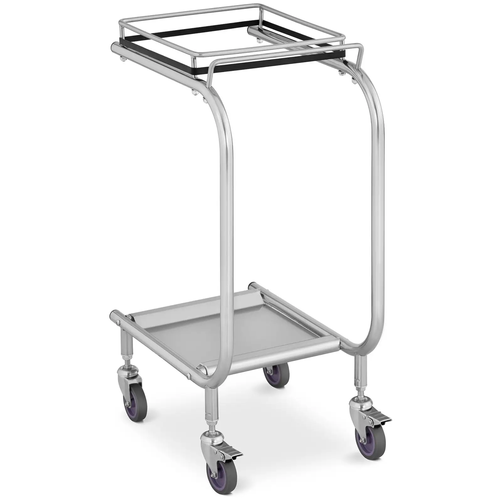 Royal Cateringin jätesäkkitelineen avulla siivoustyöt sujuvat ripeästi. Kiinnitä säkki vain tukevaan telineeseen ja siivous voi alkaa. 4 kääntyvän pyörän ansiosta voit ohjata roskapussitelinettä vaivattomasti kapeillakin käytävillä. Näppärä apulainen sopii erinomaisesti hotelleihin, asuntoloihin ja hoitolaitoksiin. Telineessä on suuri kannatin jätesäkkejä varten. Tämä pitää säkin täysin auki. Näin voit täyttää roskapussin kätevästi ja siististi tarvitsematta avata tai sulkea sitä välillä. Kätevän kahvan ja pyörien ansiosta voit helposti siirtää kestävän, ruostumatonta terästä ja muovia olevan roskasäkkitelineen haluttuun paikkaan myös täysien jätesäkkien kanssa. Kahdessa pyörässä on jarrut, kun teline halutaan sijoittaa tukevasti paikoilleen.