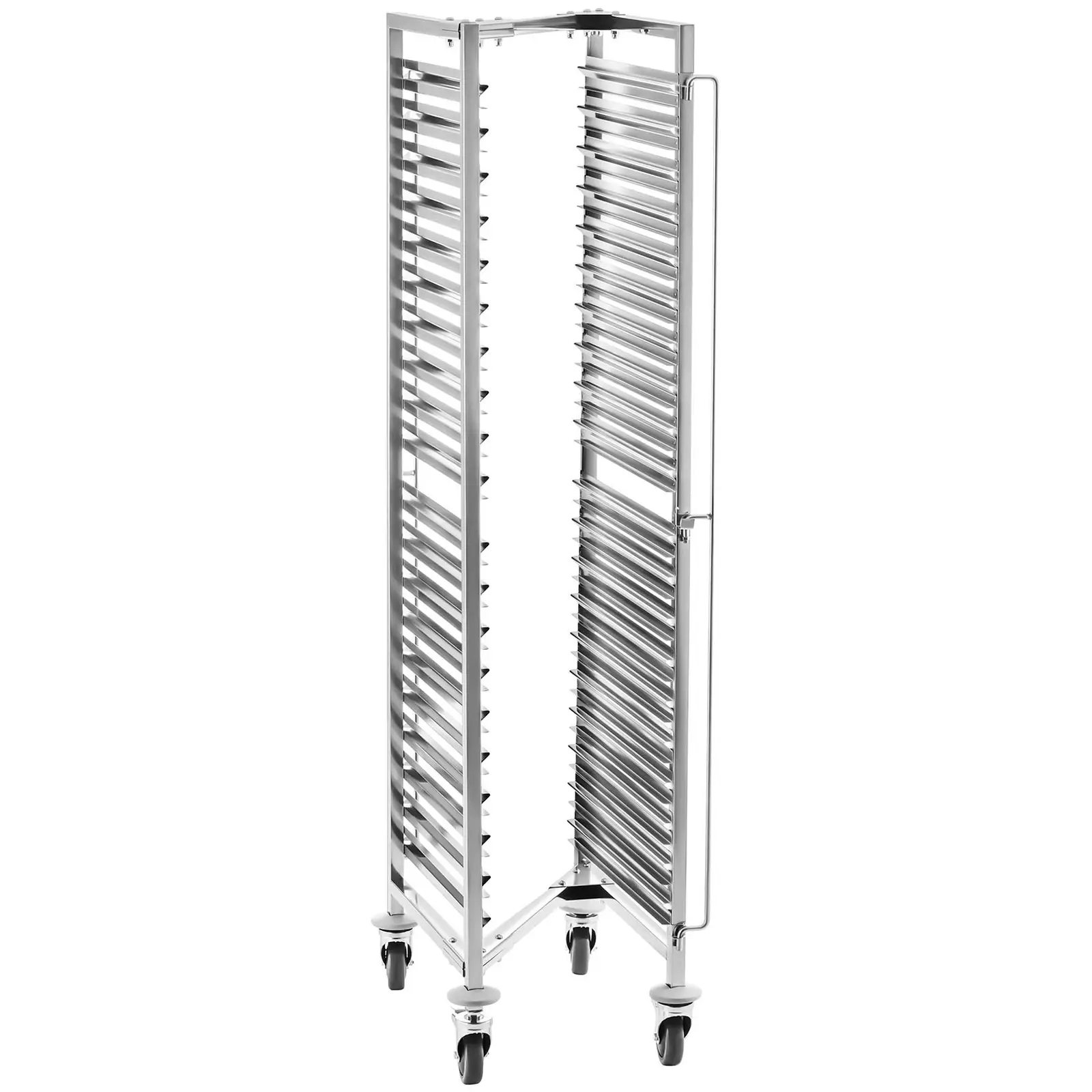 Royal Cateringin RCTW 20 GN johdevaunu on ravintola-alan välttämätön apulainen, jossa ruokien ja juomien säilytys tai likaisten astioiden kuljetus sujuu tilaa säästävästi. Hankitpa vaunun sitten suurkeittiöön, kanttiiniin, sairaalaan tai leipomoon – Royal Cateringin johdevaunulla työskentelysi sujuu tehokkaammin ja hyödyt laadusta edulliseen hintaan. Johdevaunu on valmistettu ruostumattomasta teräksestä ja siihen mahtuu jopa 20 GN-astiaa tai -tarjotinta. Voit asettaa vaunuun erikokoisia astioita (1x 1/1 GN, 2x 1/2 GN, 3x 1/3 GN, 1x 1/3 tai 1x 2/3 GN). Pystysuoran rakenteensa ansiosta tarjoaa johdevaunu paljon säilytystilaa tilaa säästävästi. Kaksi pystysuoraa varmuuskiinnikettä vaunun edessä ja takaa takaavat GN-astioiden varman paikallaan pysymisen käytön aikana. Molemmat kiinnikkeet voidaan helposti irrottaa kevyesti nostamalla ja kiinnittää uuteen paikkaan, jolloin ehkäistään astioiden putoaminen vaunusta. Neljä hyvin pyörivää, kuulalaakereilla varustettua kumista pyörää mahdollistavat joustavuuden ja helppokäyttöisyyden. Jokainen pyörä on varustettu seisontajarrulla. Hyvälaatuiset kuulalaakeripyörät takaavat tarjotinvaunun lattiaa säästävän ja hiljaisen liikkeen.