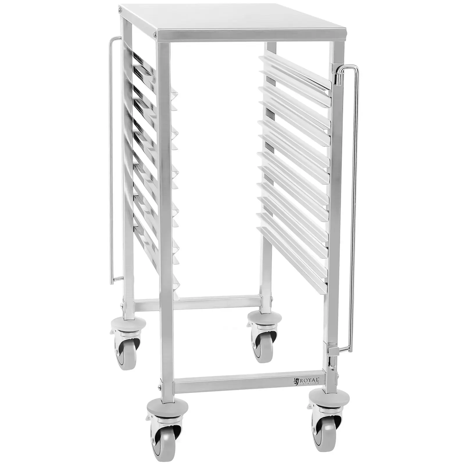 Royal Cateringin RCTW 6 GN 1/1 johdevaunu on suunniteltu ammattimaiseen käyttöön ravintola-alalla ja soveltuu monenlaiseen käyttötarkoitukseen. Olipa kyseessä sitten suurkeittiö, kanttiini, sairaala tai leipomo – Tällä Royal Cateringin myös keräilyvaununa toimivalla vaunulla, kuljetat astiat ja tarjottimet tehokkaasti ja hyödyt hyvästä laadusta edulliseen hintaan. RCTW 6 GN 1/1 johdevaunu koostuu kestävästä ruostumattomasta teräksestä ja erottuu edukseen vaatimattoman designinsa ansiosta. 55,5 cm x 38,2 cm x 95 cm kokonsa sekä 6 GN astialle sopivan täyttötilavuutensa ansiosta vaunu tarjoaa paljon säilytystilaa kompakteista mitoistaan huolimatta. Kiitos hyvän valmistuksensa ja avoimen rakenteensa on vaunun jokainen nurkka ja kulma käden ulottuvilla ja helposti sekä yksinkertaisesti puhdistettavissa. Myös täydessä lastissa oleva vaunu on helposti käsiteltävä vankan rakenteensa ansiosta. Pidikkeet tarjoavat tilaa 6:lle, kooltaan 1/1 Gastronorm-astialle. Pidikkeiden erityinen rakenne takaa varman pidon. Pidikkeet ovat 8 cm etäisyydellä toisistaan, jolloin säilytystilaa on reilusti tarjolla. Kaksi pystysuoraa varmuuskiinnikettä vaunun edessä ja takaa takaavat GN-astioiden varman paikallaan pysymisen käytön aikana. Molemmat kiinnikkeet voidaan helposti irrottaa kevyesti nostamalla ja kiinnittää uuteen paikkaan, jolloin ehkäistään astioiden putoaminen vaunusta. Neljä 360° pyörivää, kuulalaakereilla varustettua täyskumista pyörää mahdollistavat joustavuuden ja helppokäyttöisyyden. Jokainen pyörä on varustettu seisontajarrulla. Hyvälaatuiset kuulalaakeripyörät takaavat tarjotinvaunun lattiaa säästävän ja hiljaisen liikkeen erityisesti liukkailla pinnoilla.