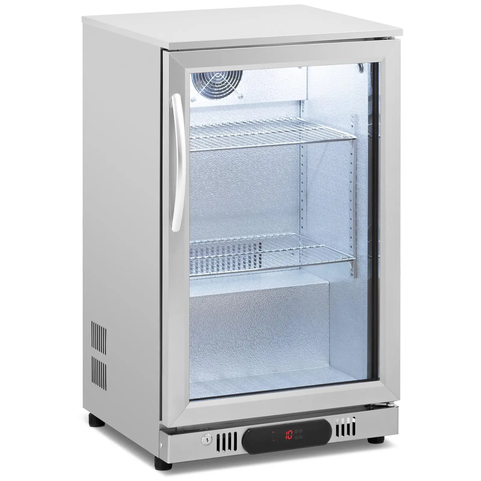 Royal Cateringin vapaasti seisovassa juomakaapissa RC-BC007 voit viilentää ja säilyttää näyttävästi mehuja, vettä, virvoitusjuomia, alkoholijuomia jne. Sen huomaamaton LED-valaistus ja tyylikäs, ruostumaton teräsmuotoilu tekevät siitä täydellisen ravintoloihin, huoltoasemille, tapahtumiin, pitopalveluun, messuille, baareihin tai toimistoihin. Jääkaappia voi tietysti käyttää myös yksityisesti juhlittaessa ystävien kanssa. Tunnelmallinen LED-valaistus takaa miellyttävän tunnelman hämärässä ympäristössä ja tavaroiden houkuttelevan esillepanon. Kaksinkertaiset lasiovet tuovat virvokkeet ja alkoholijuomat selvästi näkyviin ja takaavat samalla tasaisen lämpötilan. Saranaovi voidaan lukita avaimella luvattoman käytön estämiseksi. Vara-avain sisältyy toimitukseen avaimen hukkaamisen varalle. Tilavuus on 108 l ja kaapissa 2 hyllyä, joista jokaisen kantavuus on 30 kg. Näin ollen lasiovinen jääkaappi tarjoaa riittävästi tilaa erikokoisten pullojen säilyttämiseen. Epätasaisetkaan lattiat eivät tuota juomakaapin RC-BC007 käytölle ongelmia, koska sen jalkoja voidaan säätää 7 mm korkeudesta ja mukauttaa täten epätasaisuuksiin. Näin ollen jääkaappi seisoo vakaasti paikasta riippumatta. Alumiininen sisäpinta on helppo puhdistaa, jos juomaa sattuu roiskumaan tai kaapin sisäosa pääsee likaantumaan muusta syystä. Ruostumaton teräs ulkokuorena ei ainoastaan tarjoa esteettisyyttä, vaan se myös suojaa luotettavasti jääkaappia korroosiolta. Kuuminakin kesäpäivinä juomajääkaappi viilentää ja säilyttää virvokkeita luotettavasti 2 – 10 °C:ssa. Kompaktien mittojensa ansiosta juomakaappi sopii hyvin myös pieniin yrityksiin ja keittiöihin. Ympäristöystävällinen kylmäaine R600a (isobutaani) on yksi eniten käytetyistä kylmäaineista yksityisellä ja kaupallisella sektorilla, koska sen vaikutus kasvihuoneilmiöön on vähäinen. Sillä ei ole negatiivista vaikutusta otsonikerrokseen. Sen ominaispiirre on suuri jäähdytysteho pienellä virrankulutuksella.