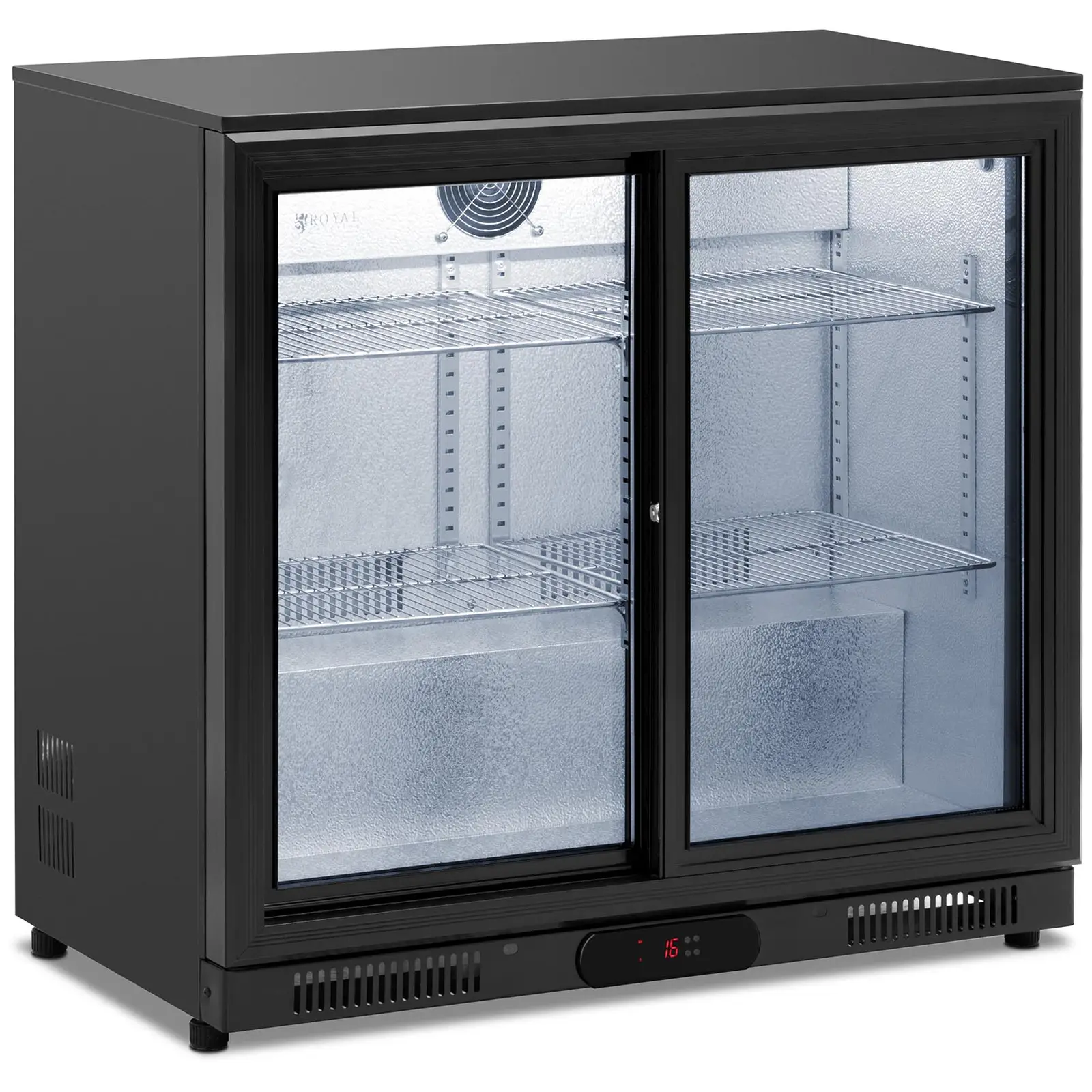 Royal Cateringin vapaasti seisovassa juomakaapissa RC-BC001 voit viilentää ja säilyttää näyttävästi mehuja, vettä, virvoitusjuomia, alkoholijuomia jne. Sen huomaamaton LED-valaistus ja tyylikäs, musta muotoilu tekevät siitä täydellisen ravintoloihin, huoltoasemille, tapahtumiin, pitopalveluun, messuille, baareihin tai toimistoihin. Jääkaappia voi tietysti käyttää myös yksityisesti juhlittaessa ystävien kanssa. Tunnelmallinen LED-valaistus takaa miellyttävän tunnelman hämärässä ympäristössä ja tavaroiden houkuttelevan esillepanon. Kaksinkertaiset lasiovet tuovat virvokkeet ja alkoholijuomat selvästi näkyviin ja takaavat samalla tasaisen lämpötilan. Liukuovet voidaan lukita avaimella luvattoman käytön estämiseksi. Vara-avain sisältyy toimitukseen avaimen hukkaamisen varalle. Tilavuus on 208 l ja kaapissa 4 hyllyä, joista jokaisen kantavuus on 30 kg. Näin ollen lasiovinen jääkaappi tarjoaa riittävästi tilaa erikokoisten pullojen säilyttämiseen. Epätasaisetkaan lattiat eivät tuota juomakaapin RC-BC001 käytölle ongelmia, koska sen jalkoja voidaan säätää 10 mm korkeudesta ja mukauttaa täten epätasaisuuksiin. Näin ollen jääkaappi seisoo vakaasti paikasta riippumatta. Alumiininen sisäpinta on helppo puhdistaa, jos juomaa sattuu roiskumaan tai kaapin sisäosa pääsee likaantumaan muusta syystä. Jauhepäällysteinen teräs ulkokuorena ei ainoastaan tarjoa esteettisyyttä, vaan se myös suojaa luotettavasti jääkaappia korroosiolta. Kuuminakin kesäpäivinä juomajääkaappi viilentää ja säilyttää virvokkeita luotettavasti 2 – 10 °C:ssa. Ympäristöystävällinen kylmäaine R600a (isobutaani) on yksi eniten käytetyistä kylmäaineista yksityisellä ja kaupallisella sektorilla, koska sen vaikutus kasvihuoneilmiöön on vähäinen. Sillä ei ole negatiivista vaikutusta otsonikerrokseen. Sen ominaispiirre on suuri jäähdytysteho pienellä virrankulutuksella.