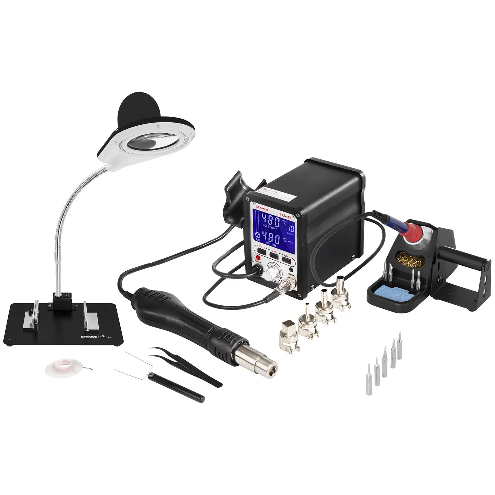 Stamos Solderingin 2-in-1 juotosasema S-LS-45 S sisältää juotos- ja kuumailma-aseman, erottuu edukseen helppokäyttöisyydellään ja tarjoaa parhaan mahdollisen työskentelymukavuuden. Se on ihanteellinen elektroniikkalaitteiden osien, kuten piirilevyjen ja metalliosien korjaamiseen ja juottoon, tinaukseen ja moneen muuhun. Setin mukana saat lisäksi suurennuslampun, joka mahdollistaa tarkan juoton ja juotteen poiston ja täyttää juotostöihin liittyvät laadulliset vaatimukset niin ammattimaisessa kuin myös yksityiskäytössä. Tehokas 70 watin juotosasema työskentelee 200 – 480 °C juottimen lämpötilalla. Täten juotoskolvin nopea lämpeneminen on taattu. Hyvälaatuinen ruostumattomasta teräksestä oleva kolvi ja lämmönkestävät bakeliitti-kierteet ovat erityisen pitkäikäisiä. Juottimen mukana saat erillisen telineen, johon on integroitu puhdistussieni, säilytyspaikat juotoskärjille ja pidike juotostinarullalle. 100 – 480 °C työlämpötilalla ja 120 litraa minuutissa olevalla ilmavirtausnopeudella 650 watin kuumailmajuotin soveltuu ihanteellisesti sekä juottoon että juotteen poistoon. Erityisesti hienorakenteisten kappaleiden, kuten pintaliitoskomponenttien (DFP, SOP, QFP, BGA, SOJ, SOT) työstö voidaan suorittaa leikiten tasaisella, portaattomasti säädettävällä kuumailman virtauksella. Usein käytetyt asetukset voidaan valita nopeasti ja helposti integroidun tallennustoiminnon avulla. 2-in-1 juotosasemassa on kolme tallennuspaikkaa, joihin voidaan tallentaa juotos- ja kuumailmakolville yksilöllisesti valitut työparametrit. Kuumailmajuotin voidaan asettaa aseman sivulla olevaan kätevään pidikkeeseen nopeasti ja turvallisesti. Juottimen pidikkeeseen on sisäänrakennettu ”Auto”-toiminto. Kuumailmakolvi menee automaattisesti lepotilaan, kun se asetetaan pidikkeeseen. Se aktivoituu vasta pidikkeestä irrotettaessa ja saavuttaa esiasetetun lämpötilan ja ilmavirtauksen. Tämä säästää energiaa ja kolvia. Jos haluat käyttää kuumailmajuotinta jatkuvasti, voit asettaa sen „Auto“-asennosta „manuaaliseen“. 2-in-1 juotosasemaa voidaan säätää yhdestä säätimestä helposti ja intuitiivisesti. Säätöä helpottaa suuri nestekidenäyttö, joka osoittaa juotos- ja kuumailmakolvin lämpötilan sekä kuumailmavirran nopeuden. Portaattomasti säädettävän kuumailmavirran ansiosta laitetta voidaan käyttää moneen tarkoitukseen – myös liiman poistoon tai maalipinnan kuivattamiseen. Tässä laadukkaassa setissä saat juotosaseman S-LS-45 S mukana monta erilaista juotoskärkeä ja kuumailmasuutinta, jotka mahdollistavat entistä tarkemman työstentelyn erilaisten tehtävien parissa. Myös luuppilamppu parantaa juotostuloksia erityisesti pieniä ja hienorakenteisia osia työstettäessä. Lisäksi juotospinsetit ja juostososien pidike sekä juotosnauha (1,5 m kela) helpottavat päivittäistä työskentelyä ja optimoivat juotostekniikkaa. Tämä juotosasema sisältää ESD-toiminnon ja sen mukana toimitetaan suojamaadoitettu pistoke (suko). Pistoke on välttämätön laitteen maadoitusta ja virheetöntä toimintaa varten. ESD-toiminto suojaa laitetta sähköstaattisilta purkauksilta ja takaa siten laitteen turvallisen käytön.