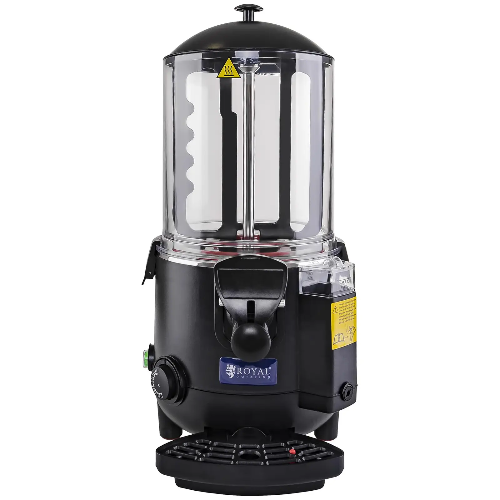 Royal Cateringin RCSS-10-kaakaokeitin vakuuttaa suurella kapasiteetillaan ja sen myötä käytännöllisyydellään. Laite on valmistettu laadukkaasta, ruostumattomasta teräksestä. Tippa-alusta on irrotettavissa, kuten myös polykarbonaatista valmistettu, läpinäkyvä säiliö. Säiliön tilavuus on 10 litraa. Laitteen suuren kapasiteetin ansiosta voit valmistaa kerralla suurempia juomamääriä ja asettaa juomat valmiiksi tarjoiltaviksi. Säiliö suljetaan kannella, joka voidaan avata helposti lämpöeristetyn kahvansa ansiosta. Laitteen alla on tippa-alusta, joka kerää ylimenevät juomat. Vankka kaakaokeitin on laadukkaiden valmistusmateriaaliensa ansiosta myös helppo puhdistaa. Kaakaokeitin on hyvin hiljainen ja sen lämpötilaa voidaan säätää nopeasti ja portaattomasti aina 90 °C asti.