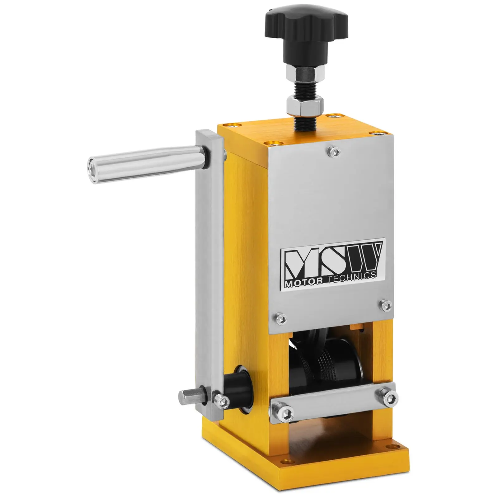 MSW:n käsikäyttöisellä WIRESTRIPPER-006-kaapelinkuorintakoneella poistat helposti, nopeasti ja tarkasti kaapeleiden, johtojen ja johdinten eristeet. Ammattimainen laite poistaa jopa sellaiset eristeet, joihin kuorintapihdit eivät tehoa. Kaapelinkuorintakone sopii yksi- ja moninapaisille kuparikaapeleille, joiden paksuus on enintään 25 mm. Pienikokoinen ja vankkarakenteinen laite suunniteltiin teollisuuskäyttöön. Laite on valmistettu teräspellistä ja siinä on hammasrattaallinen leikkuurulla. Kaapelinkuorintakone toimii käsikäyttöisesti kammella tai sähkökäyttöisellä porakoneella. Molemmilla tavoilla mekanismi liikuttaa sisäpuolen leikkuurullaa ja aloittaa leikkauksen. Laitteessa on leikkuurulla, joka leikkaa eristeet ja irrottaa ne kaapelista. Tietoja WIRESTRIPPER-006-kaapelinkuorintakoneesta: