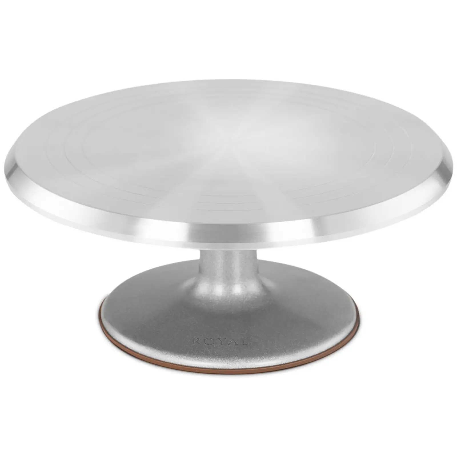 Täytekakut ja upeat pienemmät koristeelliset leivonnaiset ovat usein kuin pieniä taideteoksia, jolloin niiden esillepanon tulisi olla sen mukaista. Tällöin Royal Cateringin jalallinen kakkuvati on juuri se, mitä tarvitset tarjotaksesi asiakkaillesi makuelämyksen lisäksi myös veden kielelle tuovan, kermaisen taideteoksen. Kakkulautanen on valmistettu helppohoitoisesta alumiinista, joka vakuuttaa kiiltävällä ja hygieenisellä pinnallaan. Kestävä materiaali ei juurikaan kulu, vaikka kakkua leikattaisiin sen päällä ja se säilyttää virheettömän ulkonäkönsä myös lukemattomien käyttökertojen jälkeen. Pyöreän, joka puolelta helposti saavutettavissa olevan kakkuvadin halkaisija on reilut 31 cm ja se on ihanteellinen tarjoilualusta niin kahvilassa kuin ravintolan buffetissakin. Kakkulautanen on korotettu 13 cm ja se on käännettävä. Tämä ei tee kakustasi ainoastaan katseenvangitsijaa, jonka voit näyttää kaikilta puolilta, vaan se tekee siitä myös helposti leikattavan ja annosteltavan. Mutta käännettävä kakkuvati on myös erittäin käytännöllinen koristeluun ja yksinkertaistaa kuorrutuksen, suklaalastujen tai muiden koriste-elementtien lisäämistä, mikä tekee kakustasi ainutlaatuisen nautinnon. Silikonipohja tarjoaa vakauden, jota tarvitset kakkua ottaessasi.