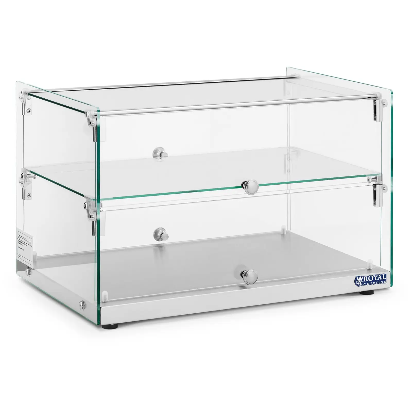 Esittele kakut, tortut, sämpylät, jälkiruoat ja muut herkut houkuttelevalla tavalla Royal Cateringin tarjoilutarvikkeiden lasitetussa kakkuvitriinissä. Tyylikäs panoraamavitriini löytyy leipomoiden, makeisten, bistrojen, kahviloiden tiskeiltä ja kaikkialta, missä tuoreet erikoisuudet tarjotaan houkuttelevalla tavalla ja pidetään samalla tuoreina. Tilavuus 50 l ja 2 tasoa, joiden mitat ovat 54×29,5 cm, kakkuvitriinissä on runsaasti tilaa tarjouksellesi. Samaan aikaan jokaiselle tasolle mahtuu jopa 10 kg piirakoita, kakkuja ja muita herkkuja. Panoraamavitriinin edessä ja takana olevat kaksi läppää mahdollistavat tuotteiden kohdistetun poiston – myös itsepalvelua varten ilman, että koko sisältö altistuu ilmalle ja kuivuu. Karkaistusta lasista ja ruostumattomasta teräksestä valmistettu gastrokakkuvitriini ei vain näytä erityisen tyylikkäältä, vaan myös vakuuttaa pitkällä käyttöiällä ja on erittäin helppo puhdistaa perusteellisesti. Liukumattomat jalat varmistavat tukevan jalan ja suojaavat pintaa luotettavasti naarmuilta ja vaurioilta.