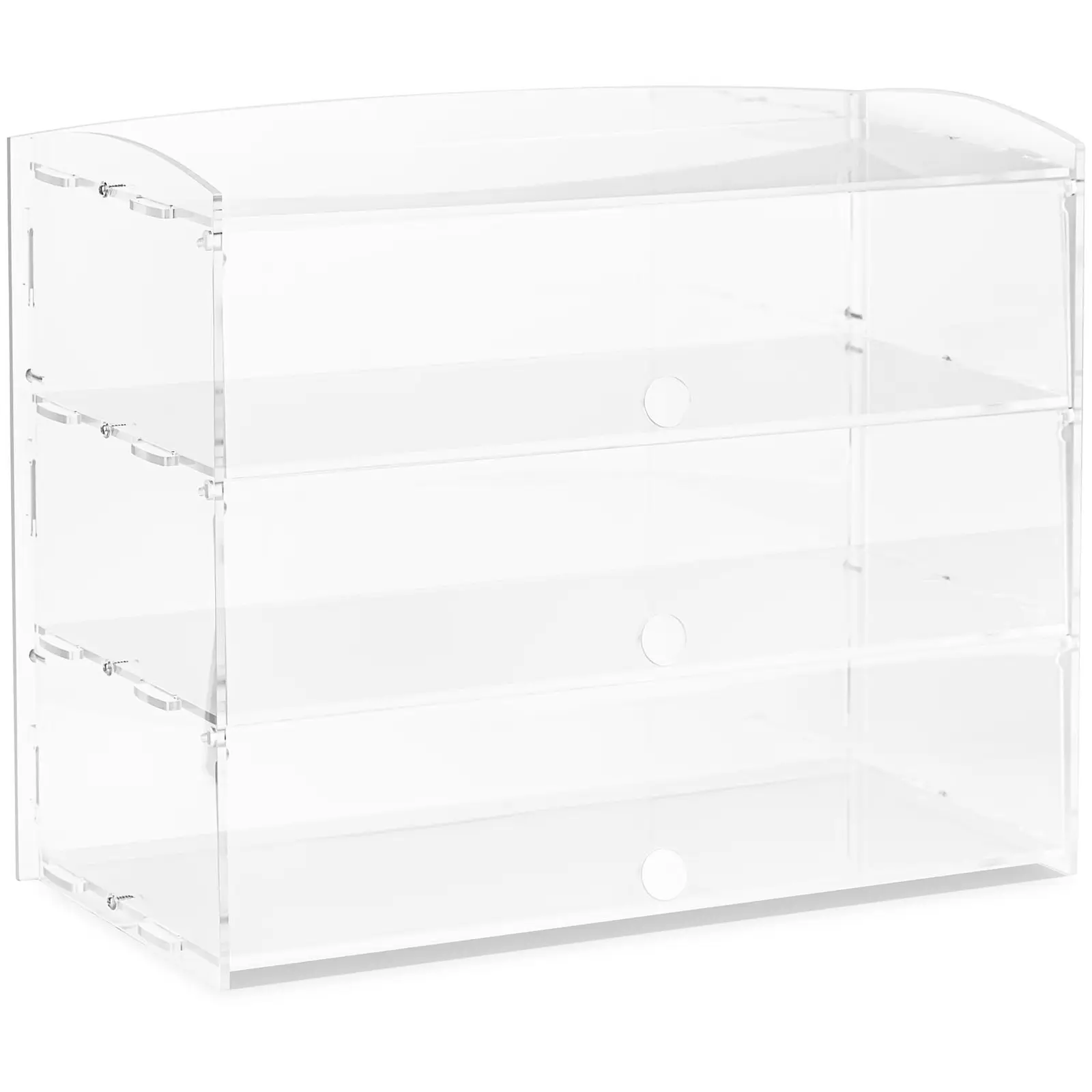 Pidä kakkupalat, bagelit, muffinit ja muut herkut houkuttelevasti esillä Royal Cateringin kompaktissa kakkuvitriinissä. Läpinäkyvä kahvilavitriini voidaan sijoittaa mille tahansa tiskille leipomoissa, kahviloissa, bistroissa ja kaikkialla, missä tahdot pitää tarjoiltavasi esillä näyttävästi ja hygieenisesti. Tämä konditoriavitriini sisältää 3 47 x 22 x 11 cm:n kokoista hyllyä, ja tarjoaa näin reilusti tilaa leivonnaisillesi. Läpinäkyvän rakenteen ansiosta voit tarjoilla kakut, piirakat ja muffinit näyttävästi, jolloin ne tekevät asiakkaisiisi varmasti vaikutuksen. Samalla herkut pysyvät suojassa hyönteisiltä, lialta ja pölyltä sekä muilta epäpuhtauksilta. Kompaktin kokoisilla hyllyillä voit säilyttää leivosten ohella muitakin esineitä, kuten leluja, koriste-esineitä, meikkitarvikkeita tai urheilupalkintoja, joten käytössäsi on samalla myös näyttelyvitriini. Vitriini on valmistettu niin, että voit koota parissa minuutissa. Akryylistä valmistettu kahvila vitriini on erityisen tyylikäs ja kestävä. 4,8 mm paksusta muovista valmistetut sileät pinnat ovat erittäin iskunkestäviä ja helppoja puhdistaa.
