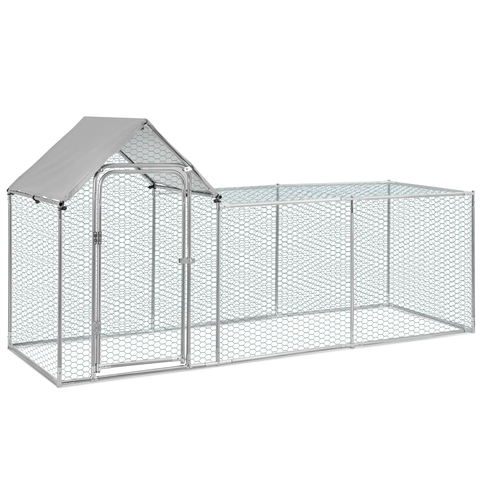 Hyvä kaninhäkki on paitsi turvallinen myös avara, jolloin eläimesi voivat liikkua virkeästi. Tällaisen paikan tarjoaa käyttöösi Wiesenfieldin kanin ulkohäkki, jonka avarat verkkoseinät ovat lähes näkymättömät. Täällä kanisi tai muut pienet eläimesi pysyvät turvallisesti yhdessä paikassa ja suojassa villieläimiltä, kuten ketuilta. Kanihäkin runko ja seinät voidaan koota nopeasti ja turvallisesti asennusohjeiden avulla. Useampi maahan kiinnitettävä kiila pitää häkin tukevasti paikallaan ja antaa sille tarvittavan vakauden. Kaikki häkin materiaalit ovat säänkestäviä ja suunniteltu ulkokäyttöön. Ulkohäkki sisältää galvanoidusta teräksestä valmistetut pylväät sekä PVC-päällysteiset seinät metalliverkosta. Sadesuojana toimii PE-peite, jonka voit tarvittaessa kiinnittää häkin harjakattoon kumilenkeillä. Jotta häkkiin kulkeminen olisi helppoa, se on varustettu suurella ovella, jonka voit myös lukita turvallisesti salvalla. Häkin rakenne on vapaasti seisova. Voitkin sijoittaa sen pihallesi juuri haluamallasi tavalla. Lisäksi häkin sisätilat ovat riittävän suuret, jotta voit asettaa sinne myös kaniesi leluja tai pesiä (ei sisälly toimitukseen). Näin luot kaneillesi monipuolisen ja viihtyisän oleskelupaikan ulkoilmaan.