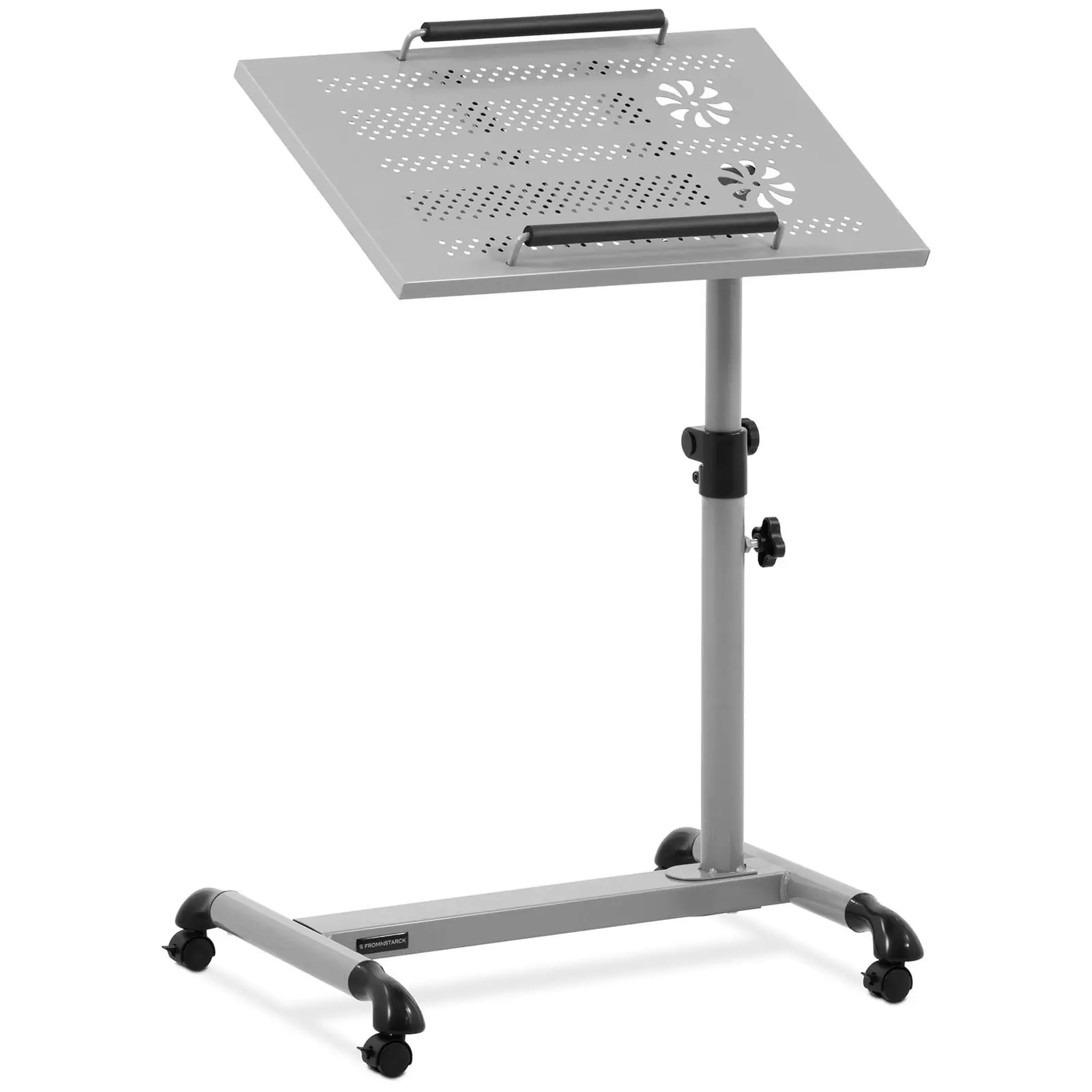 Luo liikuteltava ja mukava työpiste Fromm & Starckin läppäripöydän avulla. Se on yhtä kompakti kuin itse kannettava tietokonekin ja se tarjoaa täydellisen säilytystilan ehkäpä tärkeimmälle työkalullesi. Tukevan teräksisen työtason ansiosta pöydän pinta on erittäin kestävä. Usein tarvitset vain sopivan paikan kannettavalle tietokoneellesi, olipa se sitten esitelmää, laboratoriota tai työverstasta varten, aina kun haluat sen olevan vieressäsi. Korkeussäädettävä laptop-pöytä on mukanasi siirtyvä ja kaikkiin tilanteisiin sopeutuva työpaikka toimistoon tai kokouksiin. Läppäripöydän pinta-ala on 52 x 33 cm, jolle jopa suuret kannettavat tietokoneet mahtuvat. Ihanteellisen työasennon löytämiseksi voit asettaa ruuvikiinnitteisen säätömekanismin avulla korkeuden helposti välille 58 ja 82 cm. Jauhemaalatusta teräksestä valmistettu tukeva rakenne ja tuuletusreiällinen työtaso galvanoidusta teräksestä kestävät jopa 15 kg:n kuormituksen. Liikuteltavassa laptop-pöydässä on neljä pyörää, joiden varassa voit ketterästi työntää sen paikasta toiseen. Joustavien ominaisuuksiensa ansiosta pöytä ei sovellu pelkästään toimistokalusteeksi, vaan sitä voidaan käyttää myös yö- tai apupöytänä.