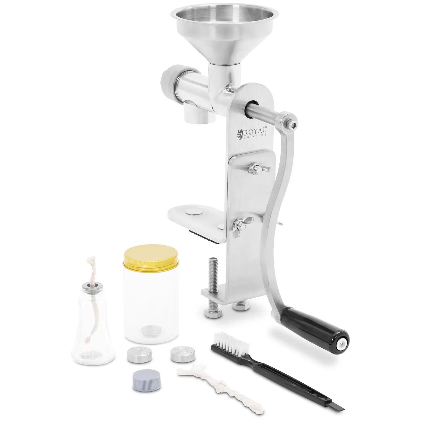 Royal Cateringin käsikäyttöisen öljypuristimen avulla voit valmistaa tuoretta öljyä hetkessä. Ruostumattomasta teräksestä valmistettu öljypuristin ei ole vain käytännöllinen keittiöväline, vaan myös ehdoton apuväline kaikille ravitsemustietoisille ihmisille. Tämä öljypuristin käsittelee monenlaisia raaka-aineita pähkinöistä siemeniin, ja se soveltuu erityisesti erilaisille jyville, siemenille ja hedelmille, joiden rasvapitoisuus on vähintään 25 %. Käytä toimitukseen sisältyvää polttoainepulloa öljypuristimen esilämmitykseen (n. 7 min) ja sen lämpimänä pitämiseen käytön aikana (n. 50 – 70 °C). Täytä pullo 80-prosenttisesti nestemäisellä polttoaineella ja käytä 15 cm pitkää sydänlankaa. Työnnä lanka kannen reiän läpi siten, että noin 5 mm jää kannen ulkopuolelle ja loput pullon sisään. Kun öljymylly on saavuttanut vaaditun lämpötilan, täytä 105 mm:n kokoiseen suppiloon vähitellen käsiteltävät raaka-aineet. Tämän jälkeen voit puristaa ne ergonomisen kahvan avulla öljyksi, jonka keräät talteen toimitukseen sisältyvään pulloon. Helppo kiinnitys pöytään takaa laitteen vakauden puristusprosessin aikana ja säästää lisäksi tilaa keittiössäsi. Ruostumattomasta teräksestä valmistettu käsikäyttöinen öljymylly täyttää myös ravintola-alan standardit, mikä ei merkitse ainoastaan korkealaatuista valmistusta vaan myös erinomaista hygieniaa ja kestävyyttä. Ruostumattoman teräksen ansiosta myös puristimen puhdistus onnistuu helposti ja perusteellisesti. Irrotettavat osat tekevät puhdistuksesta entistäkin helpompaa, jolloin myös esivalmistelut seuraavaa käyttökertaa varten sujuvat ongelmitta.