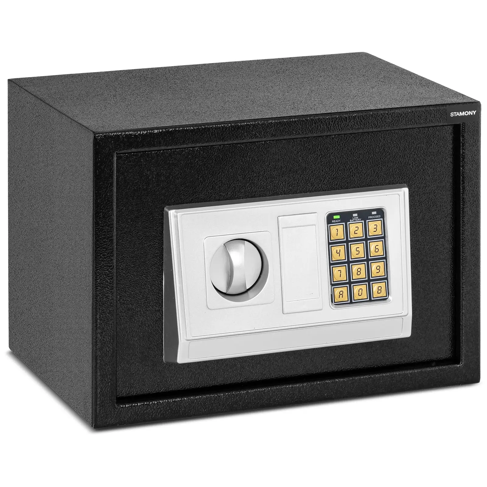 Asiakirjoja, avaimia tai myöskään tietolevyjä ei tule säilyttää avoimesti pöydillä vaan turvallisesti Stamonyn kassakaapissa ST-ES-250. Kompakti kassakaappi tarjoaa suojaa, vankkuutta ja on ihanteellinen ratkaisu, kun haluat suojata arvotavaroitasi asiattomilta. Pieni kassakaappi on valmistettu lujatekoisesta jauhepäällysteisestä teräksestä. Kompakteilla, 35 x 25 x 25 cm olevilla mitoillaan kassakaappi mahtuu kaikkiin toimistoihin ja jopa kaappeihin, jossa arvoesineitä voidaan säilyttää huomaamattomasti. Jopa 4 mm paksu teräsrakenne on varustettu kiinnitysrei’in, joiden avulla kassakaappi on kiinnitettävissä turvallisiin paikkoihin. Oven kannattimet on integroitu kassakaappiin ja niitä ei voi avata ulkoapäin. Erityispaksu kassakaappi on varustettu numerolukolla, joka voidaan ohjelmoida 3 – 8-lukuisella numeroyhdistelmällä. Täten tämä kahdella teräspultilla varustettu lukko on lähes murtumaton. Kassakaappi on avattavissa vaihtoehtoisesti hätäavaimella, jos numeroyhdistelmä unohtuu. Nämä molemmat toimituksen sisältöön kuuluvat hätäavaimet tulisi säilyttää sopivan turvallisessa paikassa. Digitaalinen kassakaappi on varustettu LED-näytöllä, joka ilmoittaa kassakaapin kunnon ja varoittaa, kun paristot käyvät vähiin. Toimituksen sisältöön kuuluvien neljän pariston ansiosta kassakaappi voidaan välittömästi ottaa käyttöön. Kaapin sisätilan pohja on vuorattu fleecekankaalla, jolla arvoesineesi säilyvät turvallisesti ja pehmeästi. Luota Stamonyn turvaratkaisuihin ja suojaa arvotavaroitasi erittäin vankalla kassakaapilla.