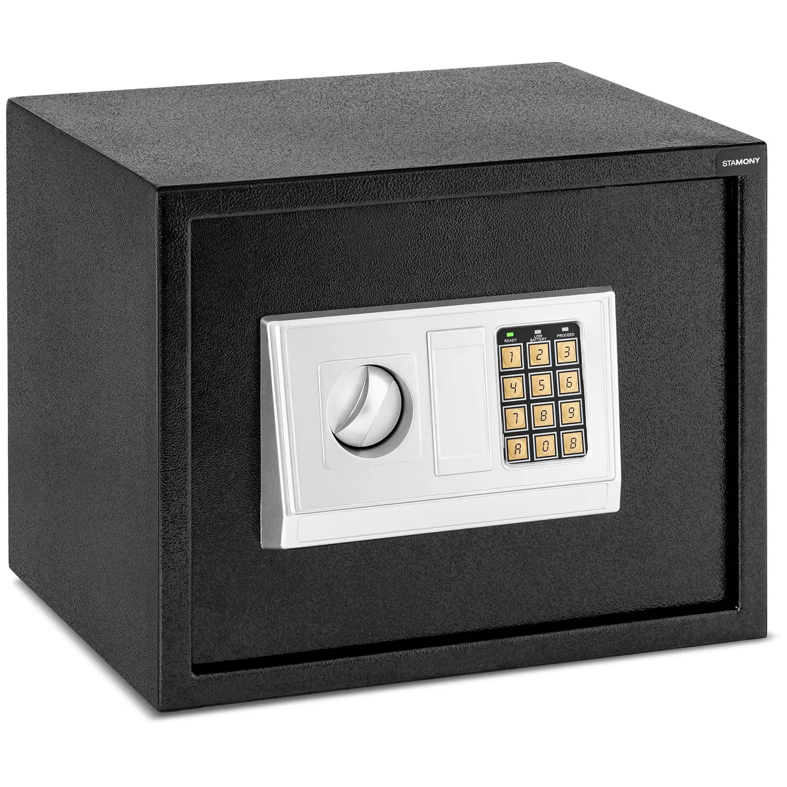 Asiakirjoja, avaimia tai myöskään tietolevyjä ei tule säilyttää avoimesti pöydillä vaan turvallisesti Stamonyn kassakaapissa ST-ES-300. Kompakti kassakaappi tarjoaa suojaa, vankkuutta ja on ihanteellinen ratkaisu, kun haluat suojata arvotavaroitasi asiattomilta. Pieni kassakaappi on valmistettu lujatekoisesta jauhepäällysteisestä teräksestä. Kompakteilla, 38 x 30 x 30 cm olevilla mitoillaan kassakaappi mahtuu kaikkiin toimistoihin ja jopa kaappeihin, jossa arvoesineitä voidaan säilyttää huomaamattomasti. Jopa 4 mm paksu teräsrakenne on varustettu kiinnitysrei’in, joiden avulla kassakaappi on kiinnitettävissä turvallisiin paikkoihin. Oven kannattimet on integroitu kassakaappiin ja niitä ei voi avata ulkoapäin. Erityispaksu kassakaappi on varustettu numerolukolla, joka voidaan ohjelmoida 3 – 8-lukuisella numeroyhdistelmällä. Täten tämä kahdella teräspultilla varustettu lukko on lähes murtumaton. Kassakaappi on avattavissa vaihtoehtoisesti hätäavaimella, jos numeroyhdistelmä unohtuu. Nämä molemmat toimituksen sisältöön kuuluvat hätäavaimet tulisi säilyttää sopivan turvallisessa paikassa. Digitaalinen kassakaappi on varustettu LED-näytöllä, joka ilmoittaa kassakaapin kunnon ja varoittaa, kun paristot käyvät vähiin. Toimituksen sisältöön kuuluvien neljän pariston ansiosta kassakaappi voidaan välittömästi ottaa käyttöön. Kaapin sisätilan pohja on vuorattu fleecekankaalla, jolla arvoesineesi säilyvät turvallisesti ja pehmeästi. Luota Stamonyn turvaratkaisuihin ja suojaa arvotavaroitasi erittäin vankalla kassakaapilla.