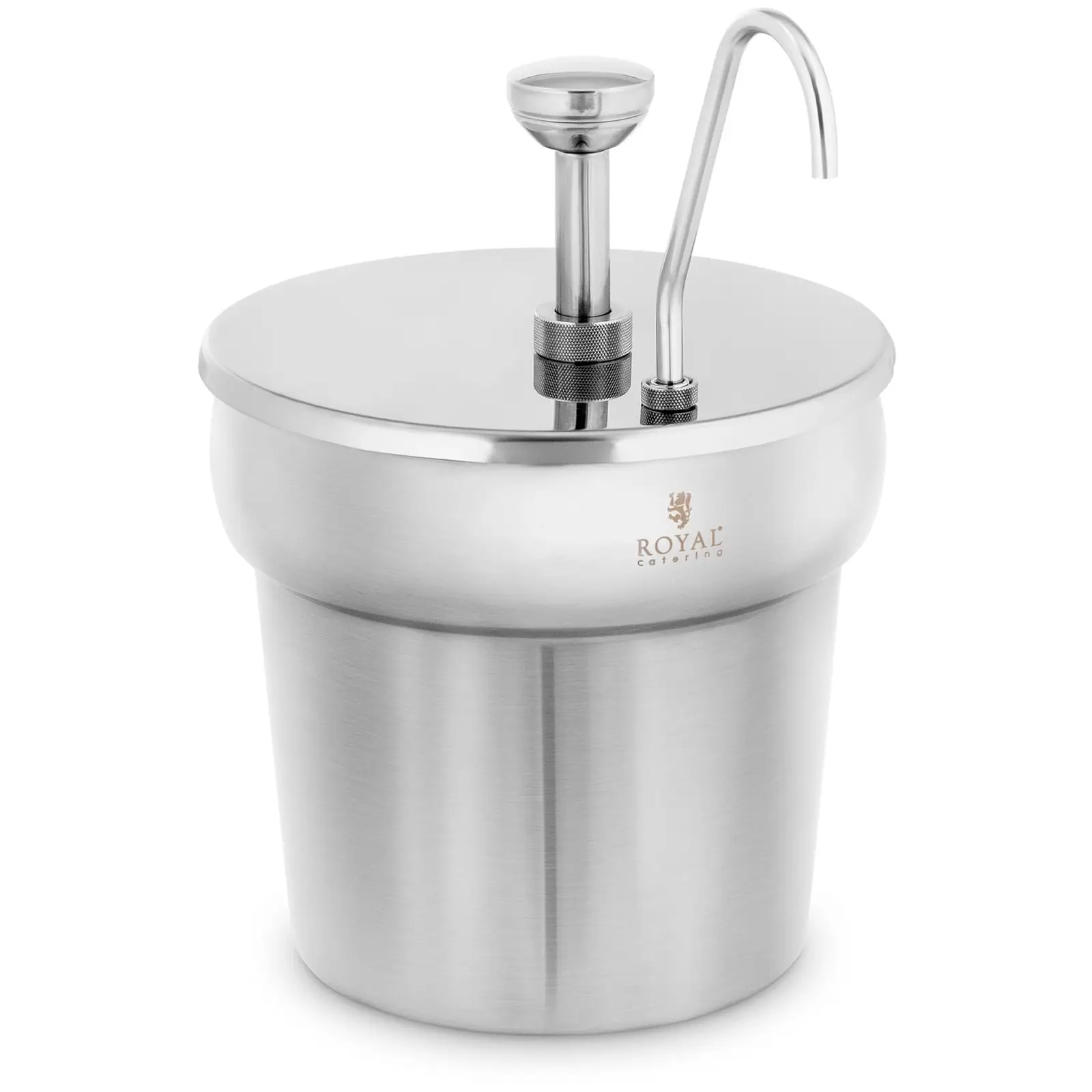 Ketsuppi, majoneesi, sinappi: Royal Cateringin kastikeannostelijalla vieraasi maustavat itse omat herkulliset välipalansa. Pumppuannostelija annostelee kastikkeet ja dipit nopeasti ja puhtaasti. Ruostumattomasta teräksestä valmistettu tyylikäs kastikeannostelija on helppokäyttöinen ja sopii erinomaisesti ruokaloihin, keittiöihin, välipalabaareihin ja hampurilais- tai nakkikioskeille. Annostelet kastikkeet puhtaasti ja nopeasti yhdellä pumpun painalluksella. Täten pumppu sopii eriomaisesti itsepalveluun. Asiakkaasi valitsevat ja annostelevat lempikastikkeensa ranskalaisille perunoille tai nakkisämpylään pumpun painalluksella. Ruostumattomasta teräksestä valmistettu annostelija on kehitetty erityisesti ravintola-alalle. Tilavuudeltaan 6,6 litran annostelija on täytettävä vain harvoin uudelleen. Näin ollen se pitää työmäärän alhaisena. Kansi voidaan irrottaa täyttämisen ja puhdistuksen helpottamiseksi. Myös pumpun voi puhdistaa erikseen ilman kantta. Pienihuokoinen pinta on erittäin hygieeninen ja ruostumaton.