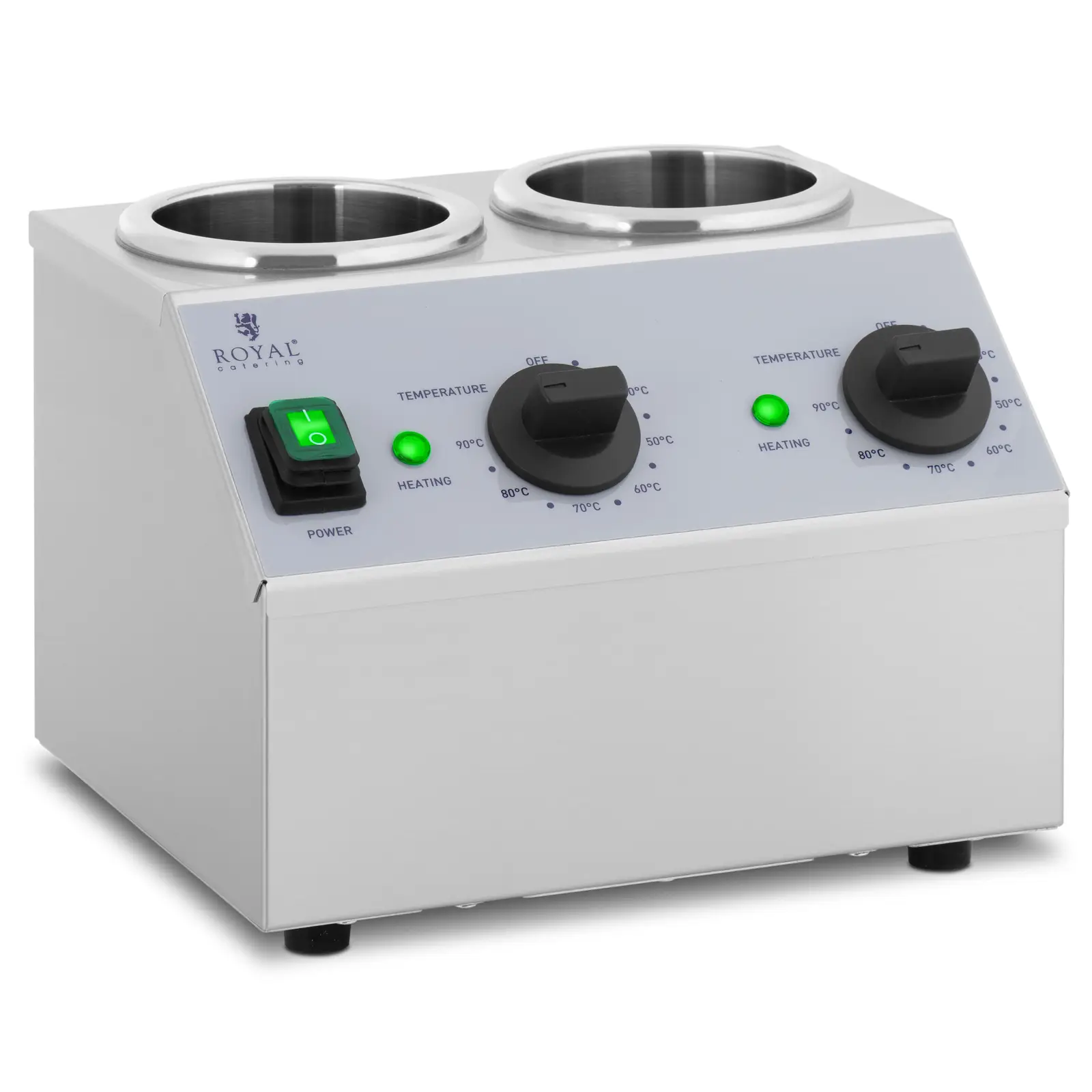 Pitävätkö vieraasi lämpimistä kastikkeista? Tarjoa heille tällöin helposti annosteltavaa kastiketta juuri lämmitetystä pullosta! Lämmität kastikepullot tehokkaasti ja nopeasti Royal Cateringin kastikelämmittimellä! Olipa kyseessä sitten juusto-, chili- tai grillikastike nachoille tai nakeille, lämmittimellä jokainen kastike saavuttaa optimaalisen lämpötilansa. Lisäksi kastikelämmitin soveltuu suklaakuorrutteiden lämmittämiseen, jolloin letut ja vohvelit saavat koostumukseltaan juuri oikeanlaisen kuorrutteen. Vakuutu yhden litran pulloille sopivan kastikelämmittimen yksinkertaisesta ja intuitiivisesta käytettävyydestä. Aseta kastikepullot syvennyksiin ja valitse haluamasi lämpötila kiertosäätimellä 40 – 90 °C väliltä. Aseta laite päälle virtakytkimestä, jolloin valo osoittaa laitteen käyttötilan. 400 W tehon ansiosta haluttu lämpötila saavutetaan nopeasti. Yläreunassa sijaitseva käyttöpaneeli on erittäin selkeä ja tarjoaa aina maksimaalisen kontrollin kastikkeen lämmitykseen. Kutakin pullopaikkaa kohden on oma lämpötilasäädin. Näin lämmität eri lämpötilan vaativia kastikkeita samanaikaisesti. Vankka kuori on helppohoitoista ruostumatonta terästä, joka antaa aina moitteettoman vaikutelman niin buffeteissa kuin myös ruokarekoissa. Sileät pinnat on vaivatonta puhdistaa ja laite vakuuttaa vähäisillä kulutusjäljillään, vaikka se olisi päivittäisessä käytössä. Neljä luistamatonta kumijalkaa pitävät vastaavasti huolen varmasta pidosta.