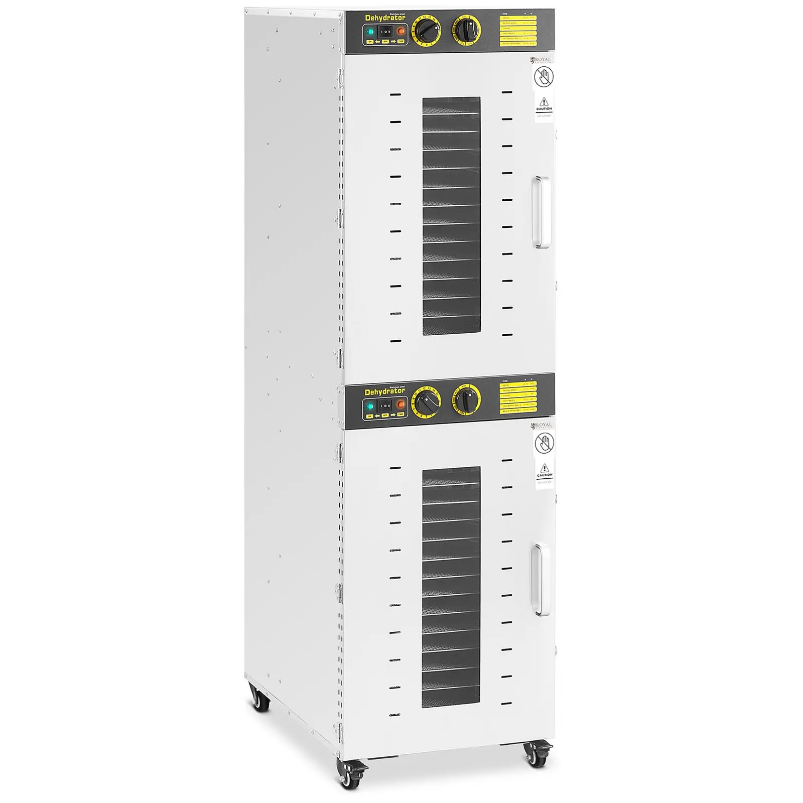 Royal Cateringin tehokas kasvikuivuri RCDA-220S mahdollistaa terveellisten, kuivattujen herkkujen valmistuksen ravintolassa, baarissa sekä kotonasi. Veden poistuminen kuivamisprosessin aikana tekee hedelmistä, kasviksista ja yrteistä sekä kalasta ja lihasta kauemmin säilyviä ja nautittavia. Kasvikuivurin 3. 150 watin lämpövastus takaa sen, että kuivuri saavuttaa haluamasi lämpötilan nopeasti ja lämpötilan kontrollointisysteemi pitää lämpötilan tasaisena. Kuivurin lämpötilaa voi säädellä 40 – 90 °C:n välillä. Lämpötila ja ajastin asetetaan intuitiivisesti ja käyttäjäystävällisellä tavalla laitteen yläosassa olevalla kiertosäätimellä. Kuivausprosessia voidaan seurata ja ohjata 0 – 15 h aikavälille säädettävän ajastimen avulla. Etupuolelta löytyy myös kuivausohje optimaalisten tulosten saavuttamiseksi. Kahdessa erillisessä kuivauskammiossa on 32 ruostumattomasta teräksestä valmistettua, irrotettavaa kuivaustasoa, jotka tarjoavat riittävästi tilaa suuren ruokamäärän kuivaamiseen kerralla. Toimitukseen sisältyvät kahdeksan silikonimattoa estävät kuivattavia tuotteita tarttumasta tasoihin kiinni. Kuivauskammion lämpö jakautuu tasaisesti kasvikuivurin sisällä, mikä mahdollistaa tasaisen kuivaustuloksen. Kumpikin kammio koostuu – samoin kuin kuori ja tasot – ruostumattomasta teräksestä, joten ne on helposti puhdistettavia ja pitkäikäisiä. Lasiovi mahdollistaa kuivumisprosessin seurannan ilman erillistä laitteen avaamista. Neljän jarrullisen pyörän ansiosta kuivuri on helposti liikuteltava ja joustavasti sijoitettava.