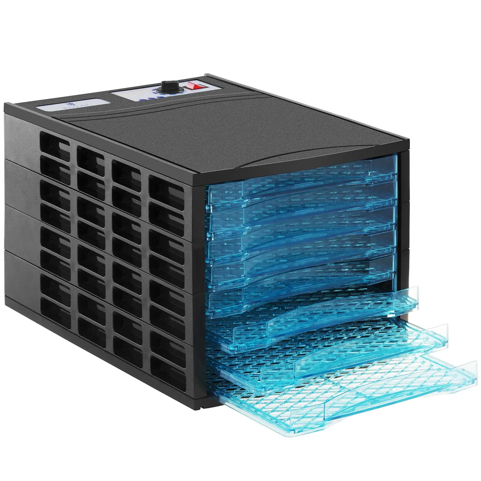Royal Cateringin tehokas RCDA-630/8P kasvikuivuri mahdollistaa terveellisten herkkujen valmistamisen ravintolassasi, baarissa tai kotona. Vedenpoisto kuivausprosessissa mahdollistaa sen, että kuivatut hedelmät, vihannekset, yrtit sekä myös kala ja liha säilyvät kauemmin ja ovat pysyvät pidempään herkullisina. Näin valmistat herkulliset omena- tai banaanisipsit yhtä nopeasti kuin kuivatut vihannesviipaleet tai kuivatun lihan. 630 watin tehoinen lämpövastus takaa sen, että kuivuri saavuttaa haluamasi lämpötilan nopeasti ja lämpötilan kontrollointisysteemi pitää lämpötilan tasaisena. Kuivurin lämpötila voidaan asettaa 32 – 68 °C lämpötilaan. Kasvikuivurin digitaalinäyttö on helppokäyttöisyytensä lisäksi myös selkeä ja näyttää lämpötilan (Celciusasteina ja Fahrenheiteina) ohella myös optimaalisen kuivauslämpötilan eri elintarvikkeille. Näytöstä voit kontrolloida ja ohjata kuivausprosessia 0 – 40 tunnin välillä. Suuressa kuivauskammiossa on 8 mukanatulevaa, astianpesukoneen kestävästä muovista valmistettua kuivaustasoa, jotka tarjoavat runsaasti tilaa ja voit kuivata suuren määrän elintarvikkeita kerrallaan. Kuivauskammion lämpö jaetaan laitteen sisällä tasaisesti integroidun tuulettimen avulla. Kammio, kuten myös sen kuori sekä kuivaustasot on valmistettu muovista, joten ne ovat erittäin pitkäikäisiä ja helppo puhdistaa. Kompakti suunnittelu ja pieni paino tekevät RCDA-630/8P kuivurista näppärän ja yleispätevän laitteen. Laitteen yläsivussa sijaitsevat kahvat helpottavat laitteen kuljetusta.