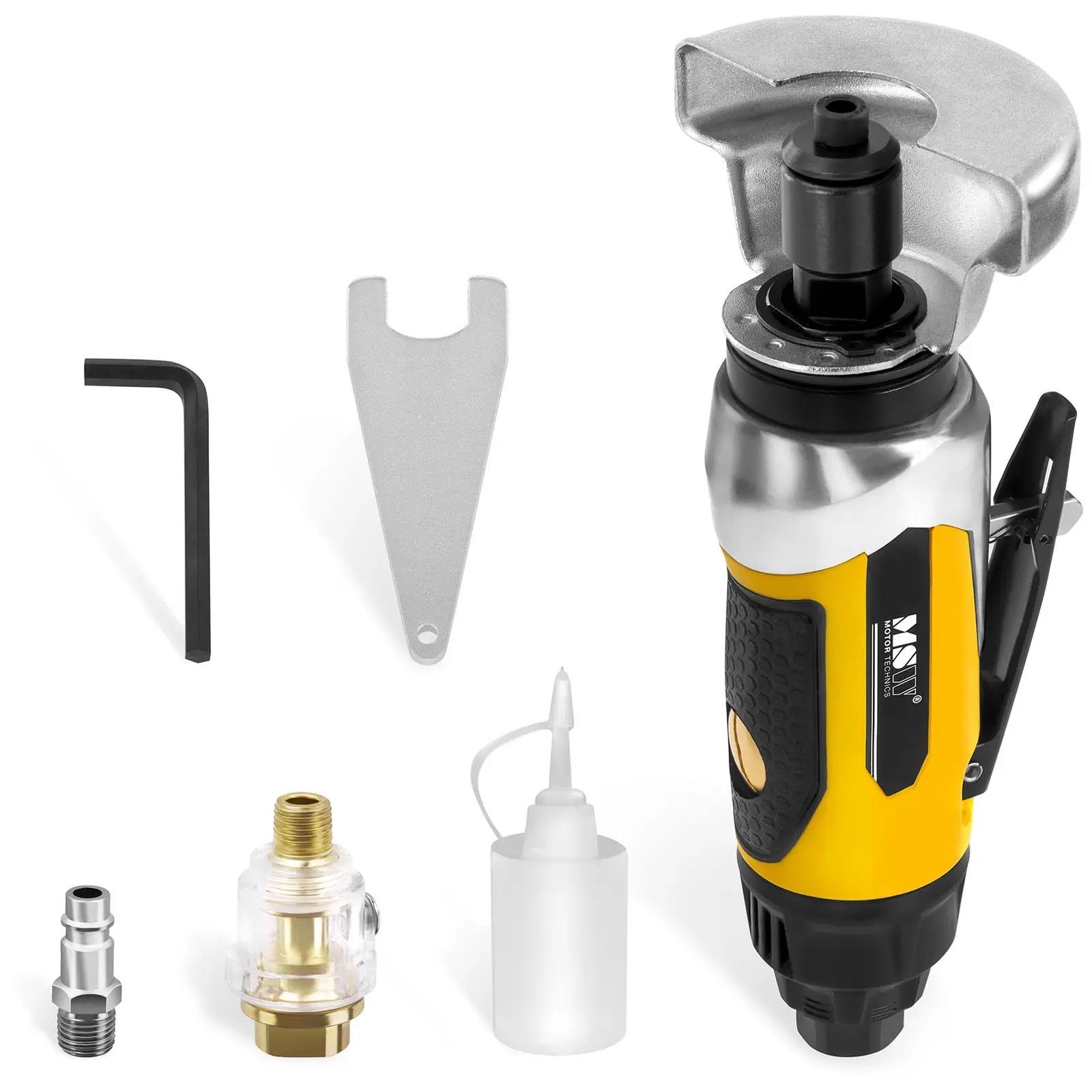 Paineilmatoiminen katkaisukone MSW-PAC3 on kätevä ja kompakti työkalu ammattimaiseen metallien hiontaan, katkaisuun, harjaamiseen ja kiillotukseen. Tämä työkalu on erityisen näppärä ajoneuvojen parissa työskentelyyn. Laitteessa yhdistyvät korkealaatuinen rakenne ja huippuluokan viimeistely. Tämä sähkötyökalu on ihanteellinen yksityiskäyttöön, jos on tarkoitus leikata tai hioa tarkasti levyjä, putkien päitä, pultteja tai muttereita. Tämä on juuri oikea työkalu vaikeapääsyisiin ajoneuvojen osiin pakoputkistossa tai korissa. MSW:n työkalut kruunaavat jokaisen verstaan ammattikorjaamosta kotinikkarin työpajaan. Loistavan tehonsa ansiosta MSW-PAC3 soveltuu moniin eri käyttökohteisiin. Puusepät, asentajat tai sähkömiehet voivat helposti poistaa tällä katkaisukoneella maalit ja ruosteen, katkaista teräsputket ja metalliprofiilit ja siistiä jäysteen hitsaussaumoista. Koneen nopeussäätimessä on neljä nopeutta, joista voit valita parhaan. Ergonomiset katkaisimet parantavat koneen käytettävyyttä ja hallintaa ja helpottavat pienten kappaleiden työstöä. Katkaisukoneen MSW-PAC3 tehokkaan moottorin tuottama suuri tyhjäkäyntinopeus on vaikuttavat 20 000 r/min. Tämä tekee koneesta juuri oikean valinnan suurta tehoa vaativiin töihin. Samalla sen ilmankulutus on kuitenkin pieni, joten et tarvitse suuritehoista ja kallista kompressoria. Katkaisukoneen mukana toimitettava öljysumutin huolehtii laitteen jatkuvasta voitelusta ja siten pidemmästä käyttöiästä. Katkaisukoneen optimaalisen käytettävyyden kannalta hyvä voitelu on äärimmäisen tärkeää. Toimitukseen kuuluvilla kiintoavaimilla voit helposti liittää paineilmaletkun ja vaihtaa suuttimia. Sinun ei tarvitse ostaa mitään työkaluja. Koneella on vakuuttavan kompaktit mitat: 8,5 x 8 x 23,5 cm ja kevyt paino. Koneen kotelo on alumiiniseosta. Tämä tekee siitä erittäin kestävän. Seosmateriaalista valmistetussa kotelossa on myös kumivaimentimet, jotka vähentävät tärinää ja lisäävät näin työskentelytarkkuutta. Märät tai hikiset kädet eivät ole liukumattoman kahvan ansiosta enää mikään ongelma. Kahvan kumipinnoite lisää sinun turvallisuuttasi ja pienentää loukkaantumisvaaraa huomattavasti. Kahva on ergonomisesti muotoiltu, siitä saa täydellisen pitävän otteen eivätkä kädet väsy. Poistoilman aukkoon voi myös asentaa 360° sivusuuntaan kääntyvän poistoilmasuojuksen, mikä vähentää paineilman käyttöön liittyviä vaaroja entisestäänkin. Kiillotettu teräksinen kipinäsuojus suojaa sinua työstössä syntyviltä kipinöiltä ja on käännettävissä 360 astetta työskentelyasennon mukaan. Turvaliipaisin estää koneen tahattoman käynnistämisen. Neliasentoinen nopeussäädin on suunniteltu niin, että nopeutta ei voi vahingossa muuttaa työstön aikana.