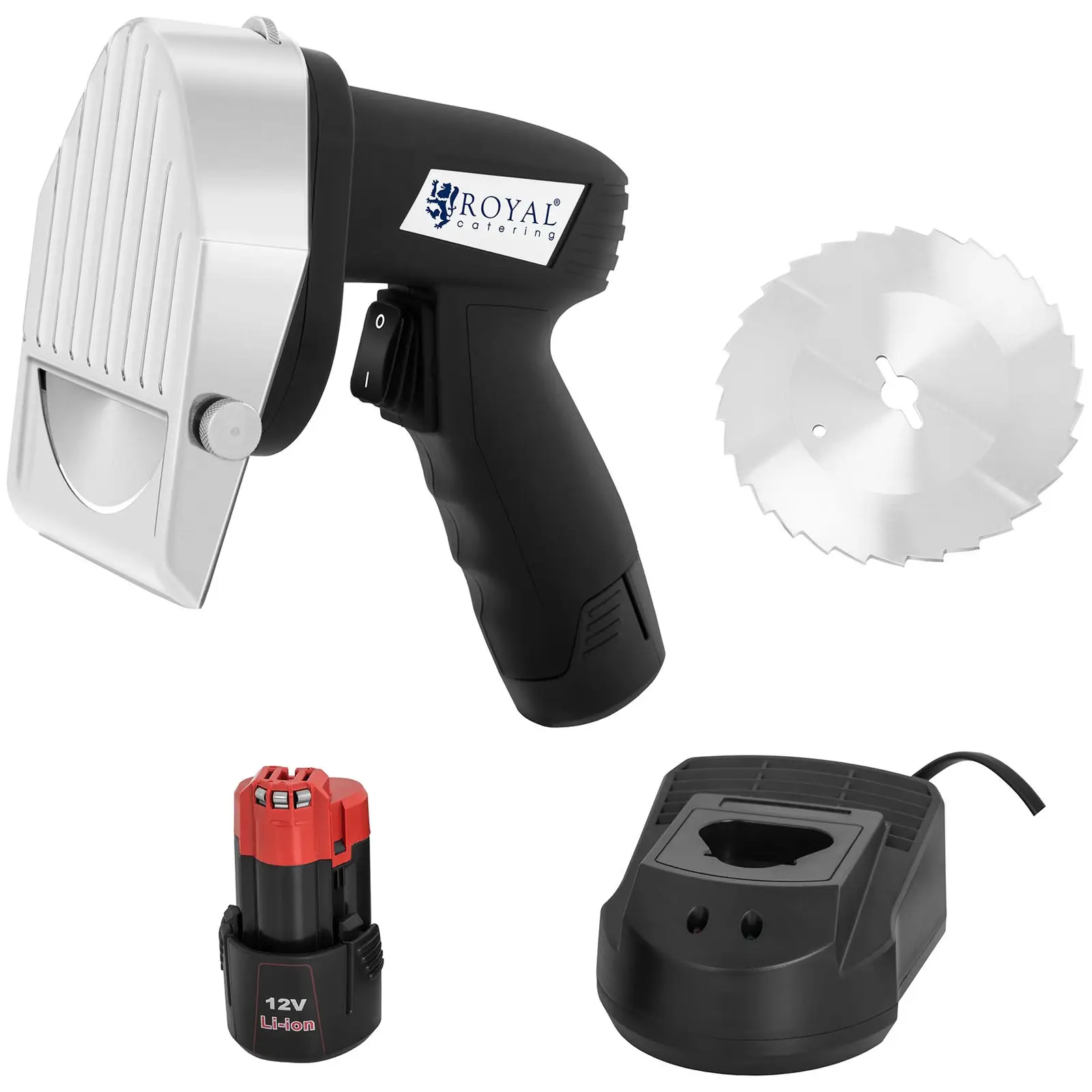 Haluatko tarjota asiakkaillesi tasaisen ohuita lihasiivuja vartaasta? Tämä ei tuota ongelmaa Royal Cateringin kebab-leikkurilla RCKK-80WL. Olipa kyseessä sitten, kebab-, gyros- tai shawarma-liha – kebab-leikkuri leikkaa grillikanaa, lammasta, kalkkunaa tai vasikanlihaa vaivattomasti ohuiksi siivuiksi. Ihanteellinen apulainen pikaruokalaasi! Sähköisen kebab-leikkurin etuna manuaaliseen verrattuna on, että se leikkaa ainoastaan ylimmän, rapean lihakerroksen – näin saavutat aina tasaiset leikkuutulokset. Virtajohto ei häiritse lihanleikkuuta vartaasta leikkurin toimiessa 2 000 mA voimakkaalla akulla noin 120 minuuttia kerrallaan. Kompaktin ja kevyen rakenteensa ansiosta laitteen ergonomisesti muotoiltu kahva istuu täydellisesti kädessä. ON/OFF-kytkintä voit käyttää painamalla pehmeästi etusormellasi. Leikkurista voit tarpeen mukaan säätää leikattavan siivun paksuudeksi 0 – 8 mm. 80 W moottorilla ja 3 000 r/min nopeudella leikkuri irrottaa myös paksummat siivut vartaasta tarkasti – jopa 60 kg lihaa tunnissa. Sileän terän lisäksi toimituksen sisältöön kuuluu sahalaitainen terä: Sileän terän ollessa täydellinen kananlihalle on sahalaitainen terä täydellinen leikkaamaan klassista kebablihaa, kuten lammasta tai vasikkaa. Kebableikkurin pyörivät terät on valmistettu pitkäikäisestä ja makuneutraalista, ruostumattomasta teräksestä, joten ne täyttävät kaikki tiukimmat ravintola-alan hygieniavaatimukset. Vaivattomasti irrotettavat, halkaisijaltaan 10 cm olevat terät on helppo puhdistaa, joten bakteereille ei jää kasvumahdollisuuksia. Jos terät tylsistyvät ajan kuluessa voit teroittaa ne mukana toimitettavalla tahkolla. Suojus ehkäisee leikkuuvammojen syntymistä ja lisää käyttöturvallisuutta. Laadukas akkukäyttöinen kebab-leikkuri – muiden valmistajien tulisi ottaa mallia siitä!