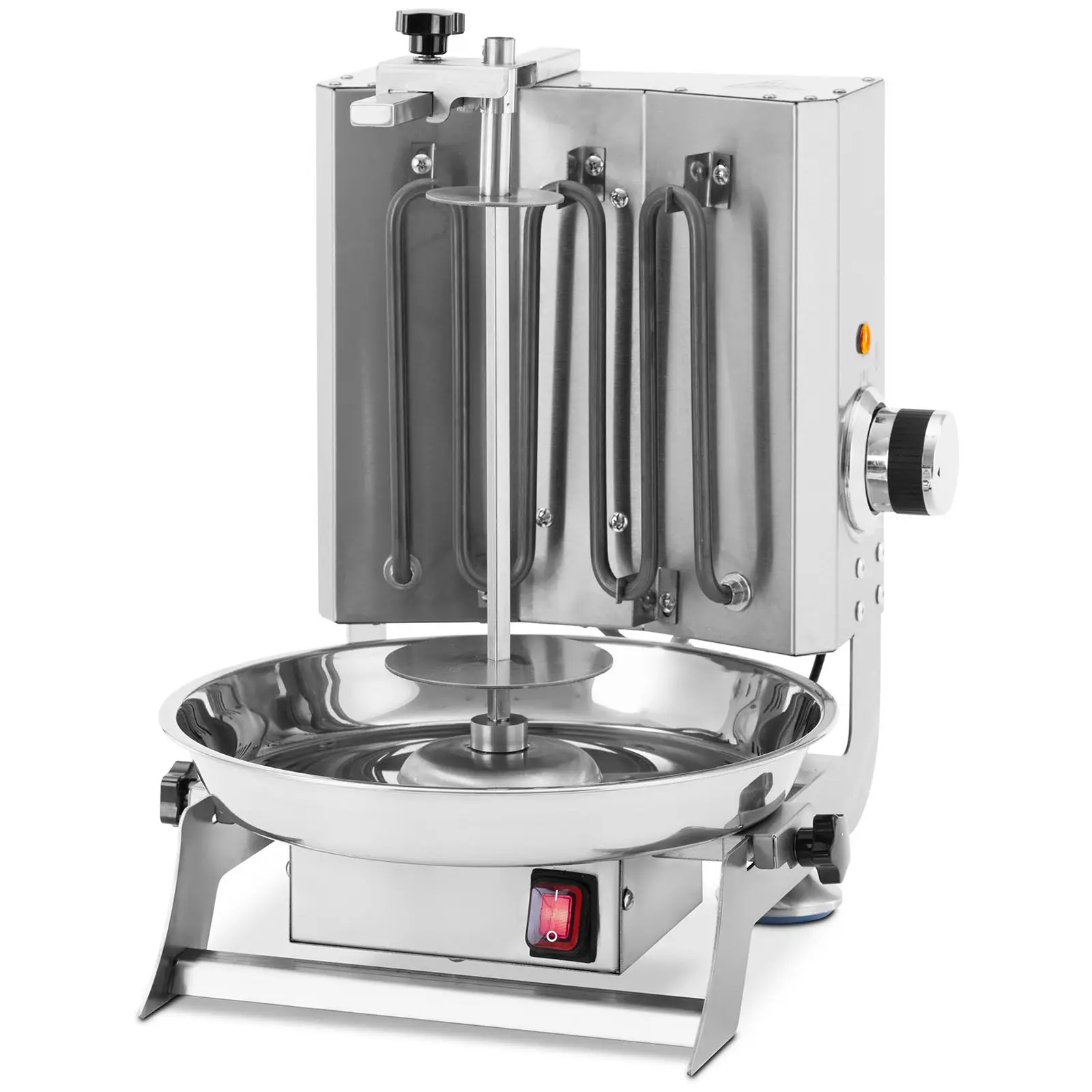 Sähköisellä kebab-grillillä valmistat rapeaa ja mehukasta lihaa milloin tahansa – olipa kyseessä sitten lammas, vasikka, kanakebab, shawarma, gyros tai meksikolainen possu. Tämä kompakti Döner-grilli tekee vaikutuksen energiatehokkuudellaan ja on lisäksi erityisen helppokäyttöinen. Koska laitetta käytetään 230 V:n virtaliitännällä eikä kaasuliitäntää tarvita, voit käyttää grilliä erityisen monipuolisesti monenlaisissa ravintolakeittiöissä. Tehokkaan lämmityselementin ansiosta kebab-kone toimii 2000 W:n teholla ja lämpenee näin erittäin nopeasti 130 °C asti. Voit säätää lämmityselementin tehoa ja ajastinta kiertosäätimellä. Lisäksi voit säätää grillauksen voimakkuutta vartaita liikuttamalla. Näin herkulliset lopputulokset on aina taattu. Varras pyörii maksiminopeudella 2,5 r/min ja takaa erittäin tasaisen grillaustuloksen. Voit asettaa vartaaseen kerrallaan enintään 8 kg lihaa. Lihan maksimikorkeus vartaassa on 180 mm. Döner-grilli sopiikin hyvin myös pienempien ruokamäärien valmistukseen. Grilli on kuitenkin äärimmäisen vankka vaativammassakin käytössä ja tarjoaa aina mahdollisuuden myös suurempien kebabsatsien paistamiseen. Kotelo on valmistettu hygieenisestä ja elintarvikeneutraalista ruostumattomasta teräksestä ja täyttää ravintola-alan tiukat hygieniavaatimukset. Korroosionkestävä materiaali antaa kebab-grillille modernin ulkonäön ja mahdollistaa nopean ja mutkattoman puhdistuksen. Tämän seurauksena kebab-grilli vakuuttaa pitkäikäisyydellään ja kestävyydellään.