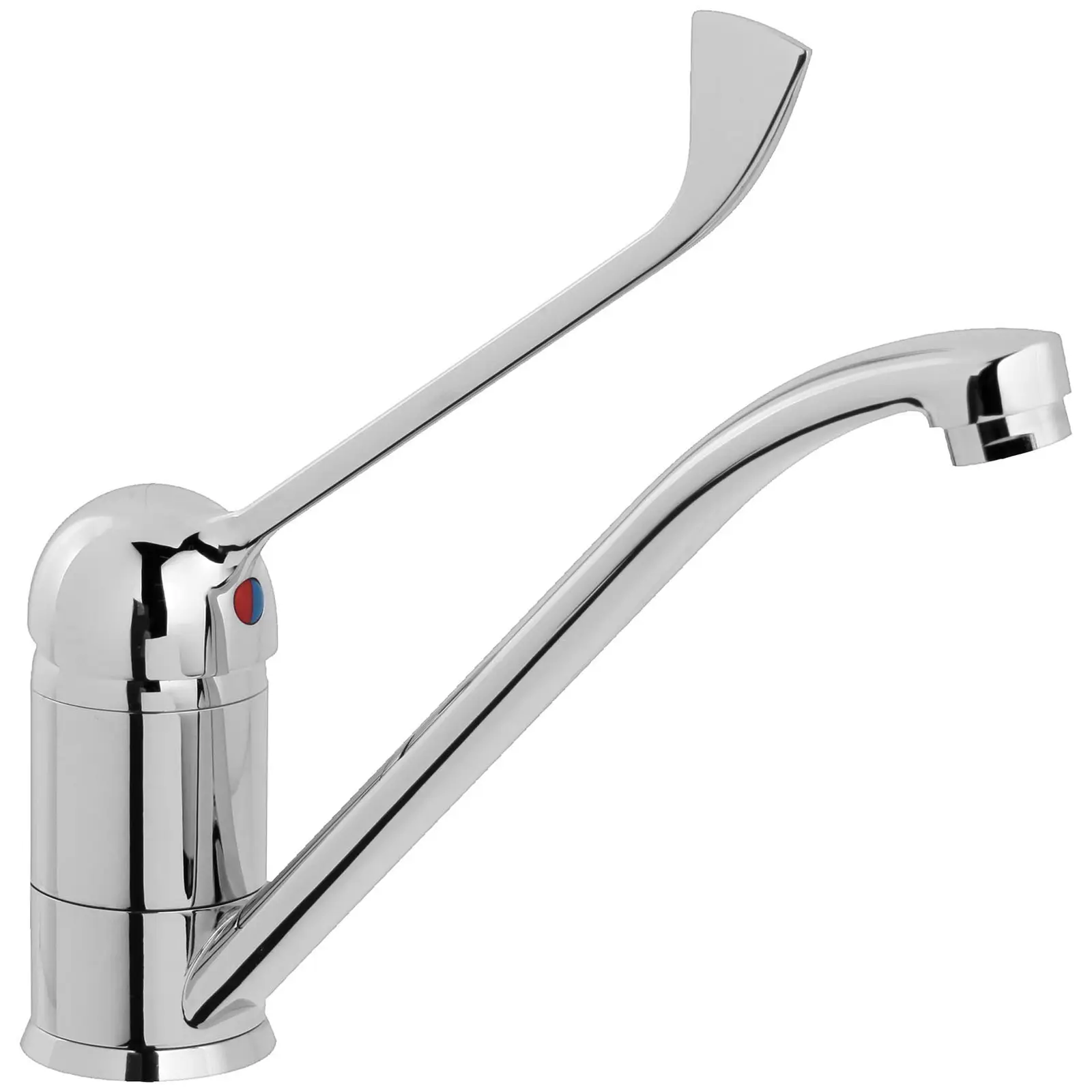 Yksiotteinen MO-TA-16-keittiösekoittaja tarjoaa 215 mm:n juoksuputkellaan korkeatasoista mukavuutta pesutöihin. Keittiössä tai kylpyhuoneessa, yksityistalouksissa tai ravintoloissa, kouluissa tai muilla käyttöalueilla: Neutraalin muotoilun ansiosta hana sopii mihin tahansa sisustustyyliin ja se on jokaisessa ympäristössä erittäin käytännöllinen. Seinäasennuksen ja pitkittäisen muotonsa ansiosta hana sopii erityisen hyvin korkeiden lasien tai kookkaampien esineiden pesemiseen niin ammatti- kuin yksityisissäkin keittiöissä. Kromattu messinki on valittu keittiöhanan materiaaliksi sen tarjoamien lukuisten etujen vuoksi: Sileä ja helposti puhdistettava pinta takaa hygieenisen ja vaivattoman työskentelyn haastavissakin tilanteissa. Samanaikaisesti tämä materiaali on erityisen kestävä ja tarjoaa yhdessä erinomaisen työstön kanssa erityisen pitkän käyttöiän. Pesuallashanassa on värilliset merkinnät kylmälle (sininen) ja lämpimälle (punainen) vedelle hanan mutkatonta käyttöä ja oikean lämpötilan nopeaa säätöä varten, mikä tapahtuu portaattomasti säädettävän, pitkän vivun avulla. G3 / 8 ”-liitännän kautta asennus on hyvin yksinkertaista ja intuitiivista, ja jokainen osaa suorittaa sen ongelmitta. Pesuhanan asentamiseksi tarvitaan vain vastaava, halkaisija vähintään 30 mm aukko pesualtaassa.