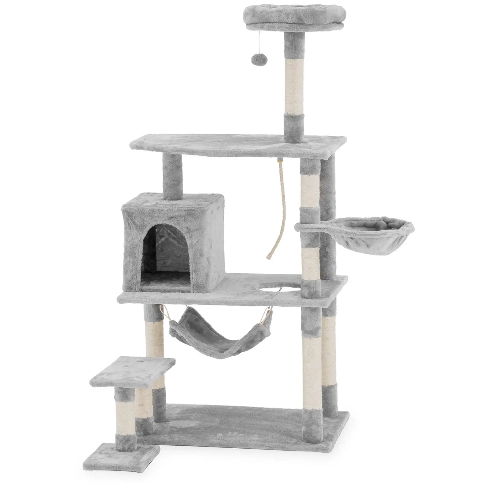 Uniprodon kissan raapimispuu tarjoaa samettitassuillesi monipuolisen paketin, jossa on useita eri tasoja, pehmoluola, kaksi riippumattoa ja pallo: Monenlaiset leikki- ja rentoutumisvaihtoehdot tukevat kissasi terveellistä ja tasapainoista elämäntapaa ja tarjoavat samalla reilusti viihdykettä. Vain 74,5 x 73 cm:n pohjapinta-alalla varustettu raapimapuu ei vie paljon tilaa, ja mahtuu siten pienimpäänkin asuntoon. 158 cm:n korkeudestaan huolimatta raapimispuu on tukevan rakenteensa ansiosta vakaa ja kestää villeimpienkin kissojen leikit. Raapimispuun tukielementit on valmistettu lastulevystä, joten ne ovat erityisen kestäviä. Vaaleanharmaan kissan kiipeilypuun pinnat koostuvat suurelta osin pehmeästä plyysistä, joita täydentävät runsaat sisalista valmistetut raapimapinnat. Materiaali on ihanteellinen kynsien hoitoon ja neutralisoi samalla hajuja, mikä luo turvallisuuden tunnetta ja rauhoittaa kissoja. Sisalin karkea mutta kestävä pinta soveltuu hyvin myös venyttelyyn. Tämä kissan raapimispylväs on helppo ja nopea pystyttää yksityiskohtaisten käyttöohjeiden ansiosta. Korkealaatuiset materiaalit sekä vankka rakenne ja tarkka työstö takaavat, että valikoimamme kissakalusteet myös kestävät käyttöä pitkään.