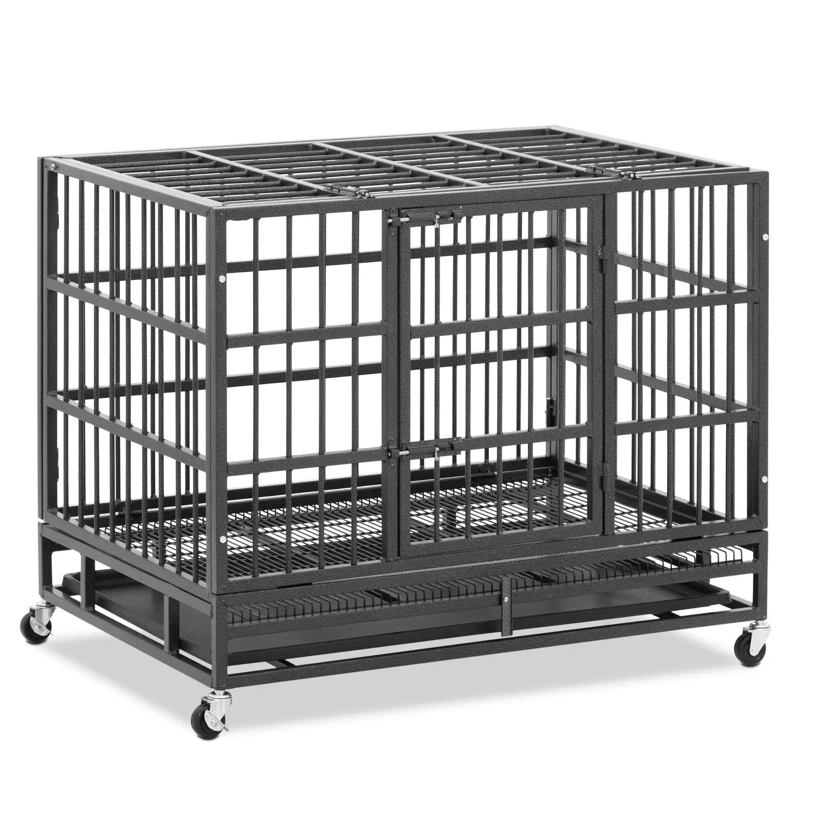 Olipa kyseessä nukkumapaikka kotona, puutarhassa tai matkoilla ja kuljetuksen aikana, kahdella ovella varustettu koiran häkki on loistava tapa varmistaa lemmikkisi turvallisuus. Tukevan teräsverkkorakenteen ansiosta voit pitää koiraasi silmällä myös häkin ollessa suljettuna. Tämä 95 x 65 x 77,4 cm:n kokoinen malli sopii keskikokoisille ja pienille koiraroduille. Neljä kääntyvää pyörää helpottavat lemmikkisi kuljettamista ja häkin siirtämistä haluttuun paikkaan. Kaksi seisontajarrua pitää häkin luotettavasti paikallaan. Voit koota koiran kuljetushäkin nopeasti ja helposti ilman ylimääräisiä työkaluja. Kaikki tarvittavat asennusmateriaalit sisältyvät toimitukseen. Lemmikkisi tulee sisään ja poistuu koirahäkistä lukittavan, 35,5 x 52,5 cm suuren oven kautta. Sinulla itselläsi on pääsy häkkiin sen yläosassa sijaitsevan 116 x 74 cm mittaisen aukon kautta, joten voit helposti täyttää koirasi ruokakupit tai antaa sille rapsutuksia. Häkin seinät ovat tiheäsilmäiset ja varmistavat optimaalisen ilmankierron sekä hyvän näkyvyyden häkistä ulos. Tämä koiran metallihäkki on valmistettu korkealaatuisesta teräksestä. Häkin materiaali on kestävää, helppohoitoista ja kestää puremista. Lukituksen ansiosta fiksuinkaan koira ei pääse karkaamaan häkistä epähuomiossa. Tippunut ruoka ja koiran jätökset kerääntyvät rakenteen alaosassa sijaitsevaan muoviseen keruuastiaan, joka pitää häkin sisätilat siistinä. Voit puhdistaa häkin helposti vetämällä astian ulos verkkokehyksestä ovea avaamatta.