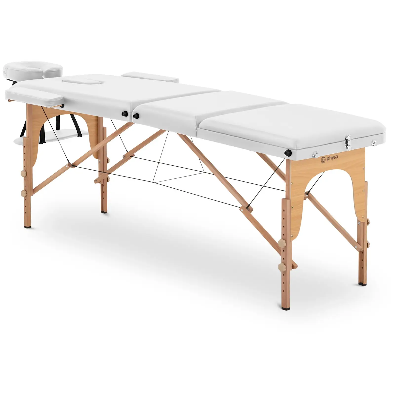 Halusitpa lisätä hierontapöytien lukumäärää tai palvella asiakkaitasi kotona taikka tomistossa – kokoontaitettavalla hierontapöytä PHYSA TOULOUSE WHITE:llä lisäät mahdollisuuksiasi tarjota hierontoja tai kauneushoitoja. Hierontapöytää on vaivaton kuljettaa, se on kädenkäänteessä koottu ja tarjoaa mukavuutta, jota asiakkaasi hieronnalta ja hyvinvointipalveluilta odottavat. Hierontapöytä on kokoontaitettuna kuin käytännöllinen matkalaukku kahvoilla, jotka sinun on vain avattava voidaksesi käyttää pöytää paikan päällä. Pyökistä valmistettu vakaa runko on helppo avata jolloin istuinosa sekä selkänoja muodostavat miellyttävän pehmustetun makuualaustan. Päätuki, käsituet samoin kuin sivupöytä ovat helposti runkoon kiinnitettävissä ja pian kaikki on valmista rentouttavaa hierontaa varten. Hierontapöydän vahva runko ja rakenne kestävät 227 kg:n kuorimituksen ja tämän vuoksi se sopii yhtä hyvin niin pieni- kuin isompi kokoisillekin. Parhaan mahdollisen työasennon saavuttamiseksi hierontapöydän korkeus on säädettävissä ruuvien avulla 60-85 cm välillä. Kumiset liukuesteet jaloissa varmistavat, että hierontapöytä pysyy paikallaan. 40 mm paksuinen valkoinen pehmuste takaa ihanteellisen mukavuuden pidemmänkin hoidon aikana. Jalkatuki voidaan asettaa eri kulmiin 15 ° – 50 °välillä. Jotta pää on aina tuettuna ja rentona, päätukea on mahdollista taitaa 45° ylös- tai alaspäin. Niskatuki tukee asiakkaalle miellyttävää lepoasentoa. Päätuen samoin kuin selkänojan pehmuste on irrotettavissa, mikä takaa miellyttävän asennon myös asiakkaan maatessa mahallaan. PVC-verhoilu ei ole ainoastaan miellyttävä, vaan myös erityisen helppo puhdistaa vedellä. Edes hoidot, joissa käytetään öljyjä, eivät vahingoita päällystettä. Kaiken lisäksi kestävä materiaali mahdollistaa huolellisen desifioinnin. Kokoontaitettavasta hoitopöydästä löytyy paikka kaikille työvälineille ja kantokassi helpottaa kuljetusta.