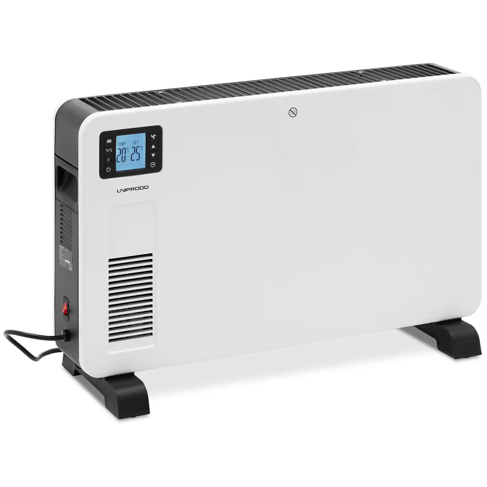 Kukaan ei pidä kylmästä: Siksi Uniprodo tarjoaa sinulle tehokkaan tavan lämmittää jopa 25 m³:n kokoisia tiloja konvektorilämmittimellä UNI_CH_01. Olipa kyseessä työpaja, autotalli tai kesämökki – tämä sähkölämmitin tarjoaa miellyttävää lämpöä kovemmillakin pakkasilla. Lattialämmitin tarjoaa kolme lämmitystasoa 1000, 2000 ja 2300 W, joiden avulla saavutat nopeasti jopa 37 °C käyttölämpötilan. Vaihtoehtoisesti voit asettaa toivotun lämpötilan välille 5 – 37 °C. Tätä varten lämpöpuhallin imee ympäröivän ilman tuulettimeen ja lämmittää sen valitun lämmitysasetuksen mukaisesti. Voit ottaa haluamasi tason käyttöön laitteen ohjauspaneelin kautta, joka on varustettu selkeästi luettavalla LCD-näytöllä. Vaihtoehtoisesti voit ohjata lämmitintä toimitukseen sisältyvällä kaukosäätimellä. Kun haluat rajoittaa lämmitysaikaa, voit asettaa integroidun ajastimen välille 1 – 24 tuntia. Lisäksi ylikuumenemissuoja sammuttaa laitteen automaattisesti, jos se kuumenee liikaa käytön aikana. Lämmitin on vankan ABS-muovista valmistetun runkonsa ansiosta erittäin kestävä. Materiaali tekee vaikutuksen pitkällä käyttöiällään ja korkealla lämmönkestävyydellään. 1,7 m pitkä virtajohto mahdollistaa laitteen käytön joustavasti eri huoneissa ja tiloissa. Kompaktin rakenteen ja kätevien kahvojen ansiosta sähköpatteri on myös helppo sijoittaa haluttuun paikkaan kevyesti ja vaivattomasti.