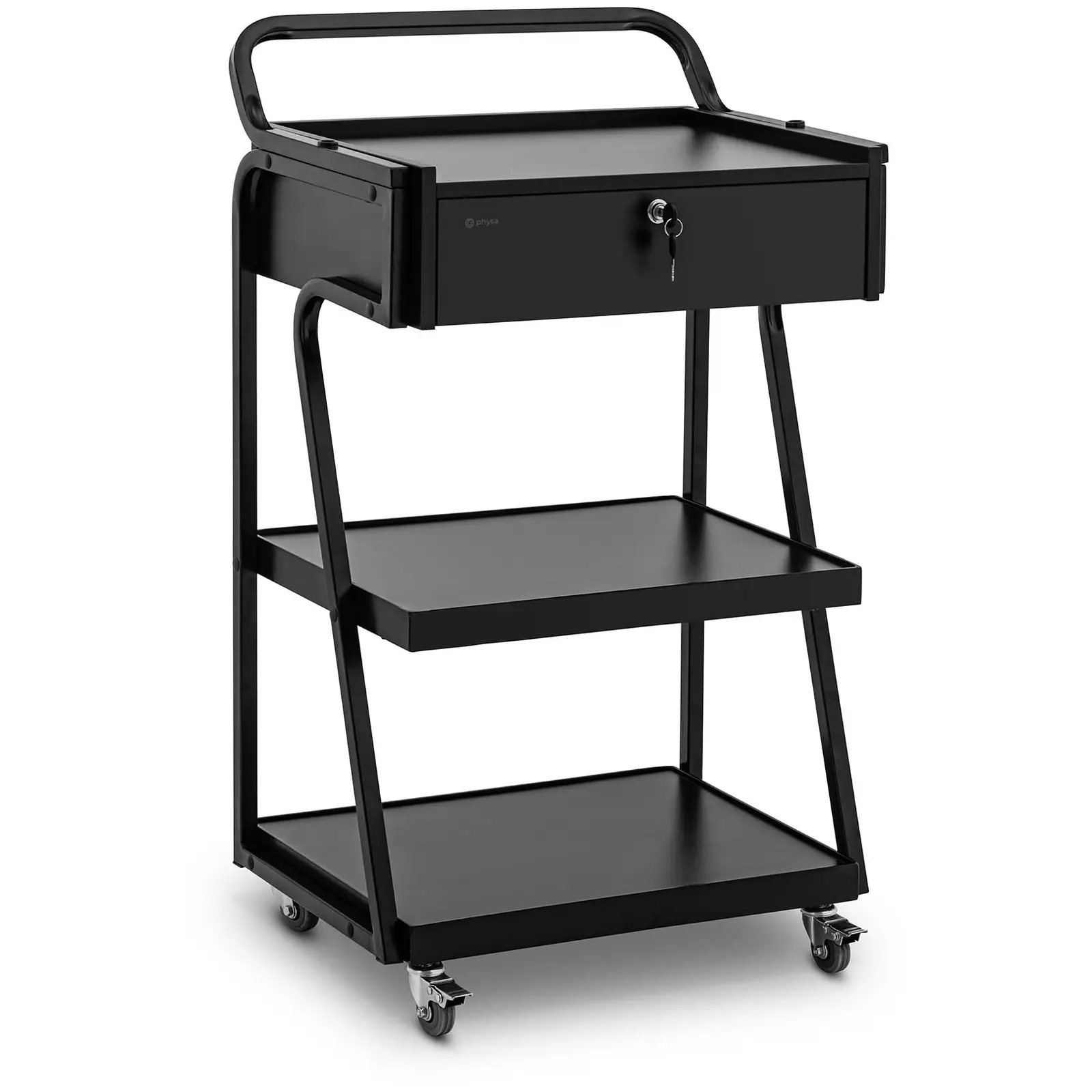Kauneus- ja terveystuotteiden asiantuntija physa on kehittänyt käytännöllisen ja liikuteltavan säilytysjärjestelmän tämän tarvikevaunun muodossa. Tilaa säästävä työtarvikevaunu auttaa optimaalisella tavalla kosmetiikan, pesuaineiden tai pyyhkeiden säilyttämisessä, oli kyse sitten kauneushoitolasta, kampaamosta tai omasta kylpyhuoneestasi. Tarvikevaunu tekee vaikutuksen yksinkertaisella mustalla muotoilullaan, joka sopii mihin tahansa sisustustyyliin. Kärryn suunnittelussa on kiinnitetty erityistä huomiota hyvään liikkuvuuteen. Tästä syystä tämä työkärry kampaamoon tai kauneushoitolaan sisältää 4 kevytliikkeistä pyörää. Voit työntää sen ongelmitta haluamaasi paikkaan myös täyteen lastattuna. Lisäksi se on erittäin kevyt. Kampaamon työkärry tarjoaa käyttöösi runsaasti säilytystilaa yhden lukittavan vetolaatikon ja 3 hyllyn ansiosta. Lisäksi sen kokonaiskantavuus on jopa 80 kg. Vankka teräsrunko ja sileät hyllyt on helppo ja nopea puhdistaa.