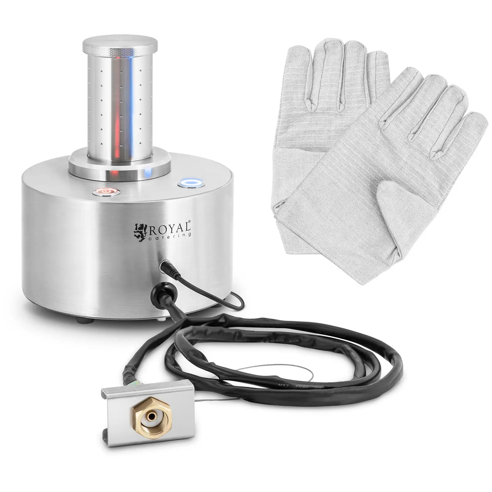 Yllätä vieraasi taiteellisilla tehosteilla ja nosta palvelualueesi uudelle tasolle. Kuivajään avulla voit saavuttaa kauniita sumuvirtoja buffetissasi tai baarissa. Käytä Royal Cateringin kuivajääkonetta kuivajään valmistamiseen muutamassa sekunnissa, jotta voit käyttää sitä tehokkaasti. Kuivajääkonetta on erittäin helppo käyttää. Liitä se ensin CO2-sylinteriin (ei sisälly) 1,5 metrin letkulla. Kytke itse kone päälle yhdellä painikkeella ja käynnistä kuivajään valmistus toisella painikkeella. Vain 112:ssa valmistetaan kuivajääpylväs, jonka mitat ovat 56 x 112 mm. Myös kuivajäätuotannon aikana syntyy sumua, joka on kuitenkin täysin vaaratonta terveydelle. Et saa koskea kuivajäätä suojaamattomana, joten löydät hansikkaat toimituksen mukana. Vankan alumiinista, ruostumattomasta teräksestä ja teräksestä valmistetun rakenteensa ansiosta kuivajääkone osoittautuu erittäin lujaksi ja kestäväksi. Neljä kumijalkaa takaavat turvallisen jalan kuivajäätuotannon aikana. Käyttääksesi kuivajääkonetta kytketään 230 V virtalähteeseen verkkolaitteen avulla, joka syöttää laitteen 24 V, 1,5 A jännitteellä. Jos haluat käyttää laitetta liikkeellä ollessasi, löydät toimituksen mukana pussin kuljetusta varten.