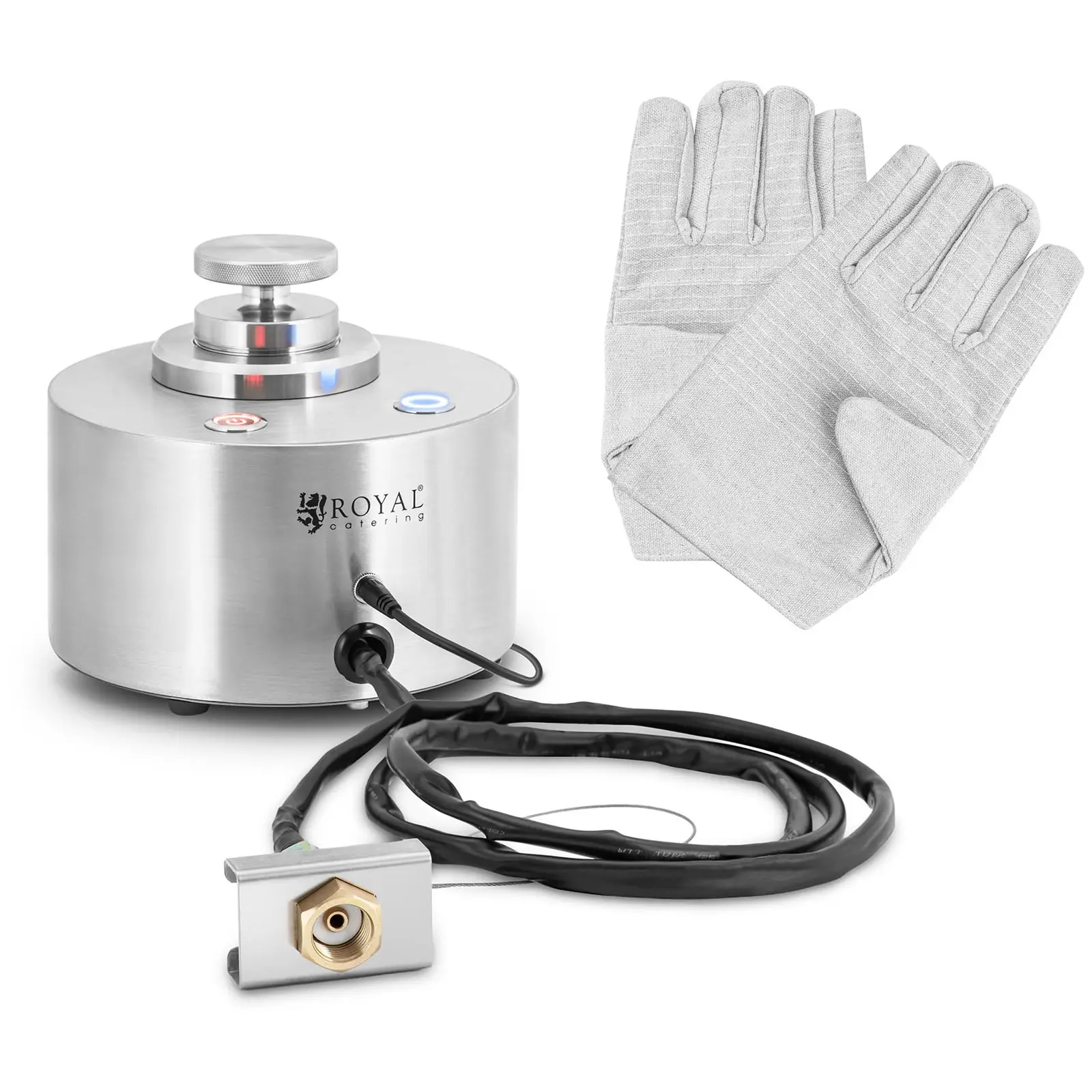 Yllätä vieraasi taiteellisilla tehosteilla ja nosta palvelualueesi uudelle tasolle. Kuivajään avulla voit saavuttaa kauniita sumuvirtoja buffetissasi tai baarissa. Käytä Royal Cateringin kuivajääkonetta kuivajään valmistamiseen muutamassa sekunnissa, jotta voit käyttää sitä tehokkaasti. Kuivajääkonetta on erittäin helppo käyttää. Liitä se ensin CO2-sylinteriin (ei sisälly) 1,5 metrin letkulla. Kytke itse kone päälle yhdellä painikkeella ja käynnistä kuivajään valmistus toisella painikkeella. Vain 21:ssa valmistetaan kuivajääpylväs, jonka mitat ovat 56 x 21 mm. Myös kuivajäätuotannon aikana syntyy sumua, joka on täysin terveydelle vaaratonta. Et saa koskea kuivajäätä suojaamattomana, joten löydät hansikkaat toimituksen mukana. Vankan alumiinista, ruostumattomasta teräksestä ja teräksestä valmistetun rakenteensa ansiosta kuivajääkone osoittautuu erittäin lujaksi ja kestäväksi. Neljä kumijalkaa takaavat turvallisen jalan kuivajäätuotannon aikana. Käyttääksesi kuivajääkonetta kytketään 230 V virtalähteeseen verkkolaitteen avulla, joka syöttää laitteen 24 V, 1,5 A jännitteellä. Jos haluat käyttää laitetta liikkeellä ollessasi, löydät toimituksen mukana pussin kuljetusta varten.