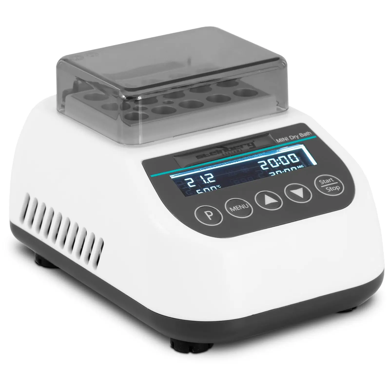 Mikroprosessoriohjauksen ansiosta Steinberg Systemsin kuivakylpy mahdollistaa tasaisen, tarkan ja toistettavan lämpötilan säädön ilman nesteitä tai höyryjä. Siksi se sopii erinomaisesti erilaisiin kokeisiin ja prosesseihin, kuten näytteen puhdistukseen, kuivaamiseen ja valmisteluun, DNA:n monistamiseen tai muovien polymerointiin. Ammattimaisiin laboratoriotarpeisiin suunniteltu laboratorion lämmityslohko takaa pienemmän kontaminaatioriskin, korkean kustannustehokkuuden, joustavuuden käytössä ja yksinkertaisen käytön. Voit määrittää tarkasti lämpötila-alueen 15 – 100 °C 0,1 °C:n resoluutiolla 70*15 cm:n LED-näytössä. Lämpötilan tarkkuus 0,5 °C, tasainen lämmönjako sekä ylikuumenemissuoja takaavat optimaaliset ja toistettavat laboratorio-olosuhteet vain 12 min n lämpenemisajan jälkeen. Käyttö on lasten leikkiä: Voit käyttää intuitiivista näyttöä ohjelmien tallentamiseen, automaattisten ohjelmajaksojen määrittämiseen tai ajastimen suhinan 1 s – 23 h 59 min avulla. Voit ohjata nopeutta helposti erillisellä painikkeella. Kuivakylvyn käyttö on erityisen monipuolista integroidun jäähdytystoiminnon ansiosta. Vaihdettavien sisäosien avulla voit myös työskennellä erilaisten näytesäiliöiden ja -kokoisten kanssa. Kompaktin koon ansiosta voit asentaa laitteen helposti ja tilaa säästävästi missä sitä tarvitset. Toinen tämän mallin etu on sen taloudellinen käyttö: 60 W teholla lämmityslohko toimii paljon kustannustehokkaammin kuin muut lämmityslaitteet, kuten lämmityskylvyt tai lämmityskaapit. Läpinäkyvä kansi vähentää myös energiankulutusta ja tarjoaa sinulle näkymän näytteistäsi aina.