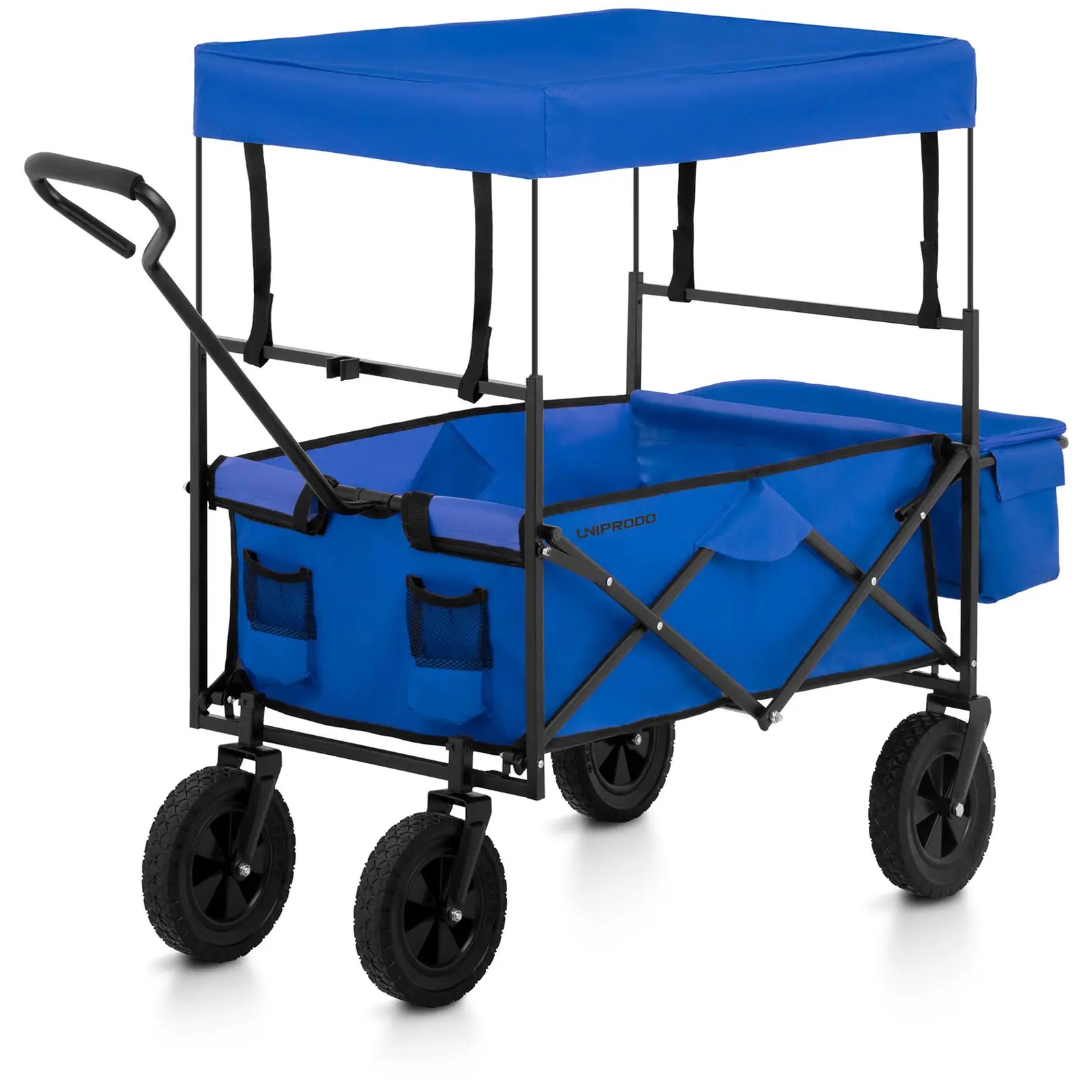 Hyvä sää houkuttelee retkelle luontoon, jonne kokoontaitettava, sininen, katollinen kuljetuskärry UNI_CART_02 on ihanteellinen seuralainen. Kokoontaitettuna sitä voidaan kuljettaa tilaa säästävästi autossa ja saapumisen jälkeen avata ja lastata kaikella, mitä halutaan ottaa mukaan puistoon, metsään tai rannalle. Lasten lelut, kori kaljaa, grilli, mukava piknikpeitto ja kaikkea siltä väliltä – tämä kaikki mahtuu käsikärryyn ja on suojassa sateelta ja auringolta kärryn katon alla. 100 kg kuormitettavuuden ansiosta voit ottaa kaiken tarvittavan mukaan retken onnistumisen takaamiseksi. Ennen retken aloittamista voit avata kokoontaitetut teräsraamit yksinkertaisesti. Yhtä vaivattomasti, vain muutamassa kädenkäänteessä sujuu katon asettaminen. Näin ollen kuljetuskärry on erityisen joustavasti käyttöön otettava ja sitä voidaan tarvittaessa säilyttää tai kuljettaa tilaa säästävästi. Kärryn polyesterikangas on samanaikaisesti lujatekoinen ja elastinen. Täyskumia olevien pyörien ansiosta käsikärry kulkee myös kovalla alustalla erityisen hiljaisesti ja iskuja vaimentaen, mikä suojaa kärryssä kuljetettavia tavaroita. Pyörät kulkevat vaivattomasti myös epätasaisella alustalla. Lisäksi kuljetuskärryä on helppo ohjata kahvan ja 360°-kääntyvien etupyörien avulla mukavasti ja varmasti. Ergonominen kahva on pehmustettu mukavuuden parantamiseksi. Lisätilaa kärryyn tuo sen takapuolella oleva ylimääräinen lokero, jossa pienemmät tavarat voidaan erikseen säilyttää. Kärryn etupuolella on kaksi pientä verkkotaskua, joissa säilytät kätevästi esimerkiksi juomapullot tai vastaavat tarvikkeet käden ulottuvilla.