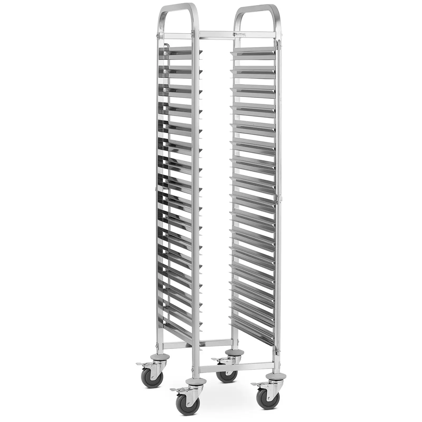 Royal Cateringin RCTW 16 GN -johdevaunu suunniteltiin ammattimaiseen käyttöön gastronomia-alalla ja se sopii monipuolisiin käyttötarkoituksiin. Ruostumattomasta teräksestä valmistettuun kuljetusvaunuun mahtuu 16 GN-astiaa ja se on mitoiltaan 59 x 42 x 171 cm, joten se tarjoaa paljon säilytystilaa sekä käyttömahdollisuuksia. Jotta GN-astiat pysyvät paikoillaan kuljetuksen aikana, on vaunussa pystysuorat varmistintangot, jotka estävät kuorman liukumisen. Neljä täyskumista, kuulalaakereilla pyörivää pyörää tekevät kuljetusvaunusta hiljaisen ja helposti työnnettävän. Lisäksi pyörissä on jarrut, jotka takaavat turvallisuuden kuormaamisen aikana. Lisätietoja Gastronorm-astioista löydät oheisista tiedostoista.