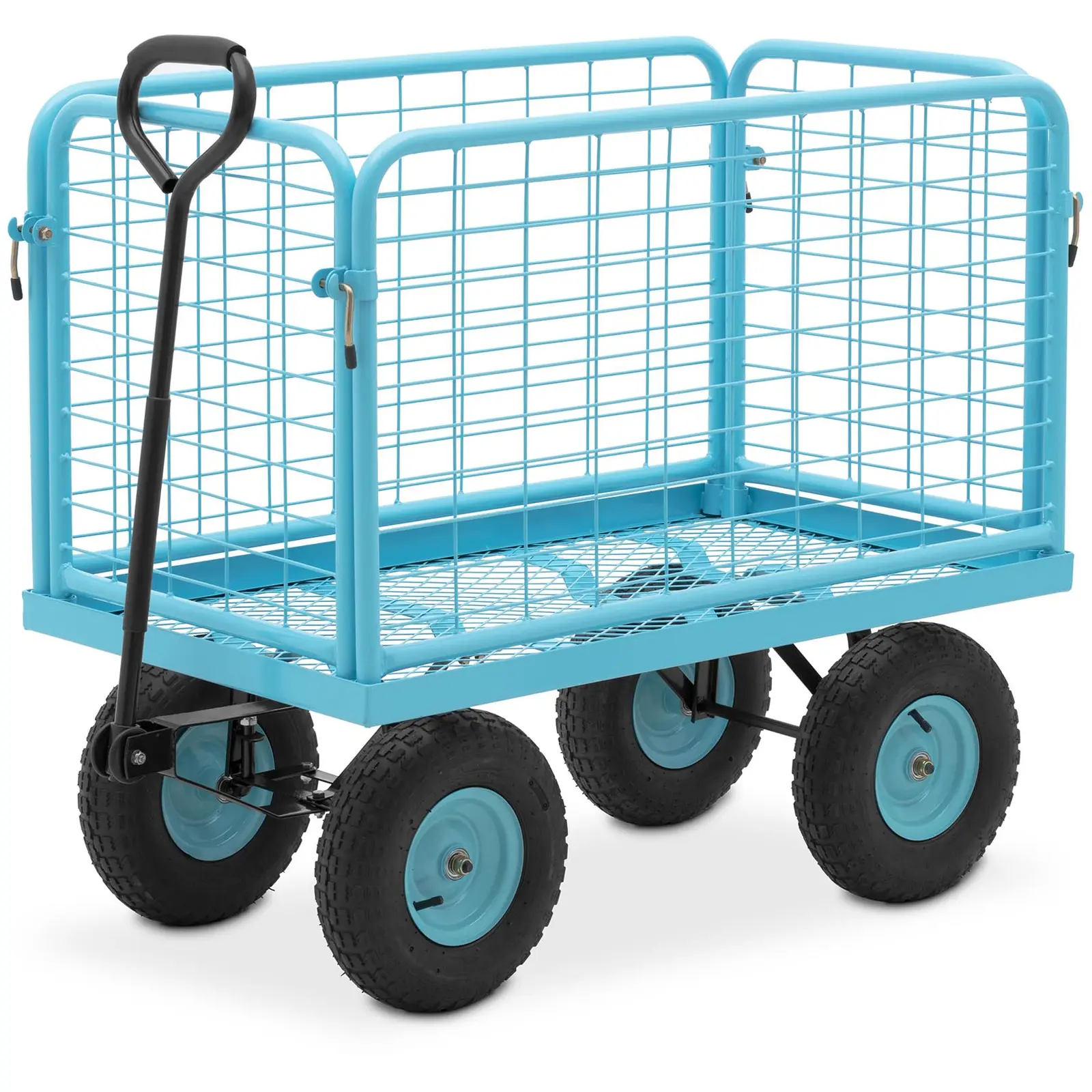 Tarvitsit sitten ristikko- tai alustavaunua: Hillvertin muunneltava kuljetusvaunu on valmis kaikenlaiseen käyttöön. Voit poistaa tai kiinnittää sivukaiteet parilla yksinkertaisella toimenpiteellä. Tällä tavalla voit siirtää isoja tai pieniä tavaroita ja helpottaa lastaamista ja purkamista. Samalla erittäin suuret kumiset pyörät selviävät helposti epätasaisista tai mutaisista alustoista. Varastoissa, kaupoissa, puutarhoissa tai maataloudessa monipuolinen kuljetusihme on apuväline, jota et pian enää halua olla ilman. Vakaan rakenteen ansiosta ristikkokärry kantaa jopa 400 kg. Vetoaisa, jota voidaan kallistaa 150°, mahdollistaa optimaalisen ohjattavuuden myös täyteen kuormitettuna; kahva, joka on pehmustettu NBR-vaahdolla, on aina mukava ja ergonominen käyttää. Sopii käytettäväksi myös puutarhavaununa epäsuotuisissa sääolosuhteissa. Pyörillä varustettu verkkovaunu tekee vaikutuksen erittäin pitkällä käyttöiällään. Tukevan rakenteen lisäksi tämän varmistaa sininen jauhemaalaus, joka suojaa teräsrunkoa korroosiolta ja muilta ulkoisilta vaikutuksilta. Kaikki muut materiaalit, kuten muovi ja kumi, soveltuvat yhtä lailla ulkokäyttöön kuin haastavaankin käyttöön varastoissa tai työpajoissa.
