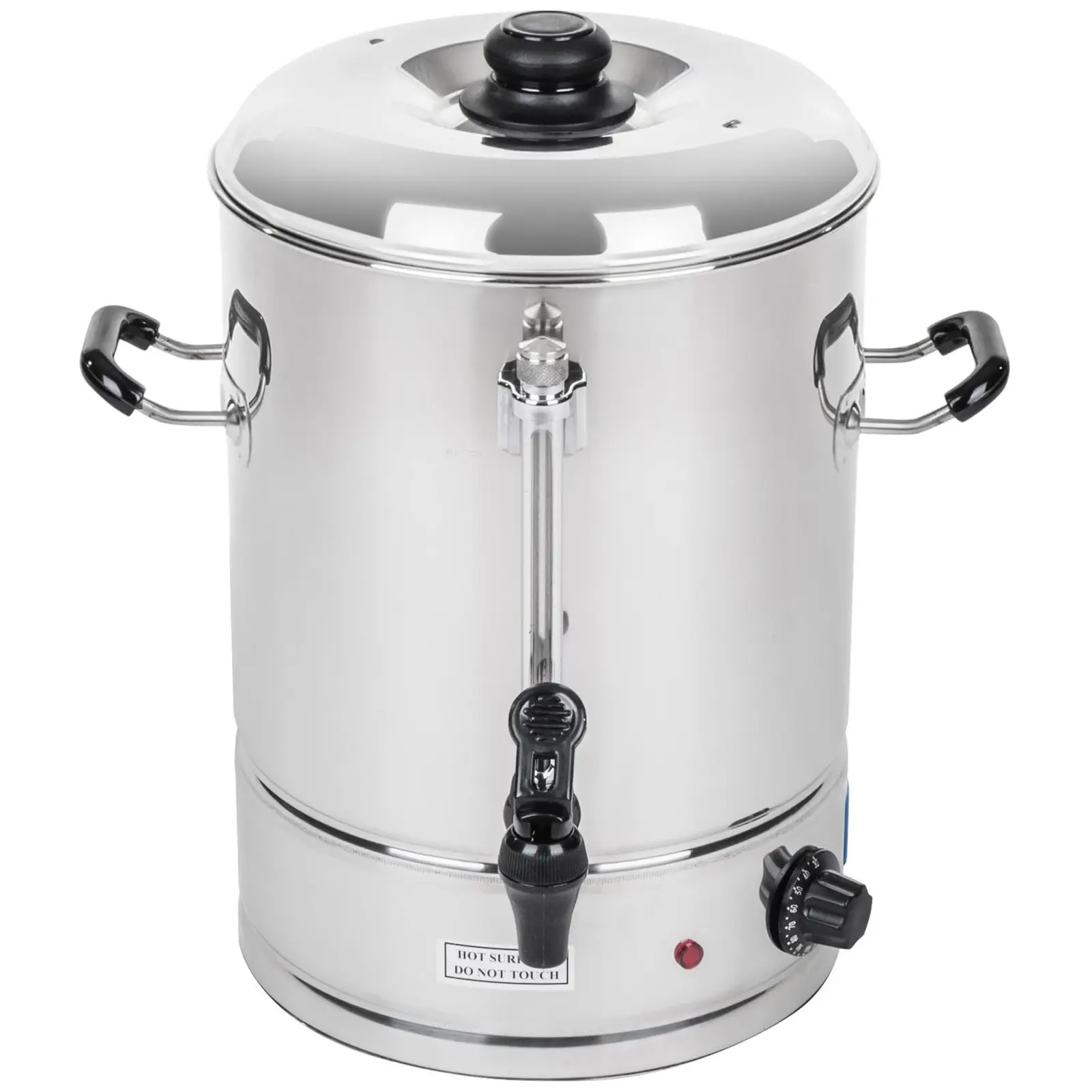 Kuumavesiannostelija – 10 litraa – 2000 W Royal Cateringin ammattimainen kuumavesiannostelija RCWK 10L tarjoaa sinulle ja asiakkaillesi jatkuvaa lämmitystä tehokkaan lämmitystehonsa ansiosta sekä kuumien juomien, kuten teen, kahvin, mutta myös alkoholijuomien, kuten glögin ja oluen kätevän valmistuksen. Tämä teekeitin soveltuu optimaalisesti erityisesti hotelleiden, catering-yritysten ja ravintoloiden käyttöön, mutta sitä voidaan myös käyttää muissa tiloissa. Royal Cateringin 10 litran vesiannostelija gastronomiatarpeitasi varten 2000 watin lämmitystehollaan ja 10 litran kokonaiskapasiteetillaan vakuuttaa RCWK 10L: n juoma-annostelija tehokkuudellaan sekä kutsuvalla ja modernilla ulkomuodollaan, joka on tervetullut näky jokaisessa buffettipöydässä. Annostelijan tilavuus on 8 litraa, mikä tarkoittaa, että nestettä voidaan kuumentaa kerralla noin 62 kuppia varten. Nykyaikaista lämmitintä voidaan käyttää säätimellä ja vesi voidaan lämmittää 30 – 100 ° C. Kuuma vesi valuu varmasti vuotamattomasta hanasta vain kun käytät sitä. Sisäänrakennettu ylikuumenemissuoja sammuttaa laitteen automaattisesti ylikuumenemisen tapahtuessa, mikä tekee siitä erityisen turvallisen. Royal Catering sähköinen glögikeitin on valmistettu kokonaan ruostumattomasta teräksestä ja on siksi paitsi helppo puhdistaa, myös tehokkaasti korroosiolta suojattu. Käytännöllinen näyttö varmistaa, että tiedät aina tarkalleen kuinka paljon vettä laitteessa on. Tämän avulla voit arvioida tarkalleen, milloin kuumavesisäiliö tulee täyttää uudelleen. Täyttäessäsi annostelijaa kansi suojaa sinua palovammoilta kuumuutta kestävällä nupilla. Laitteen liikkuvuus perustuu sen kevyeen, 2,6 kg: n painoon ja 230 voltin jännitteeseen. Siksi tuotetta voidaan käyttää missä tahansa, missä on pistorasia. Lisäksi laitteen sivuilla olevat ergonomiset kahvat takaavat helpon kuljetuksen.