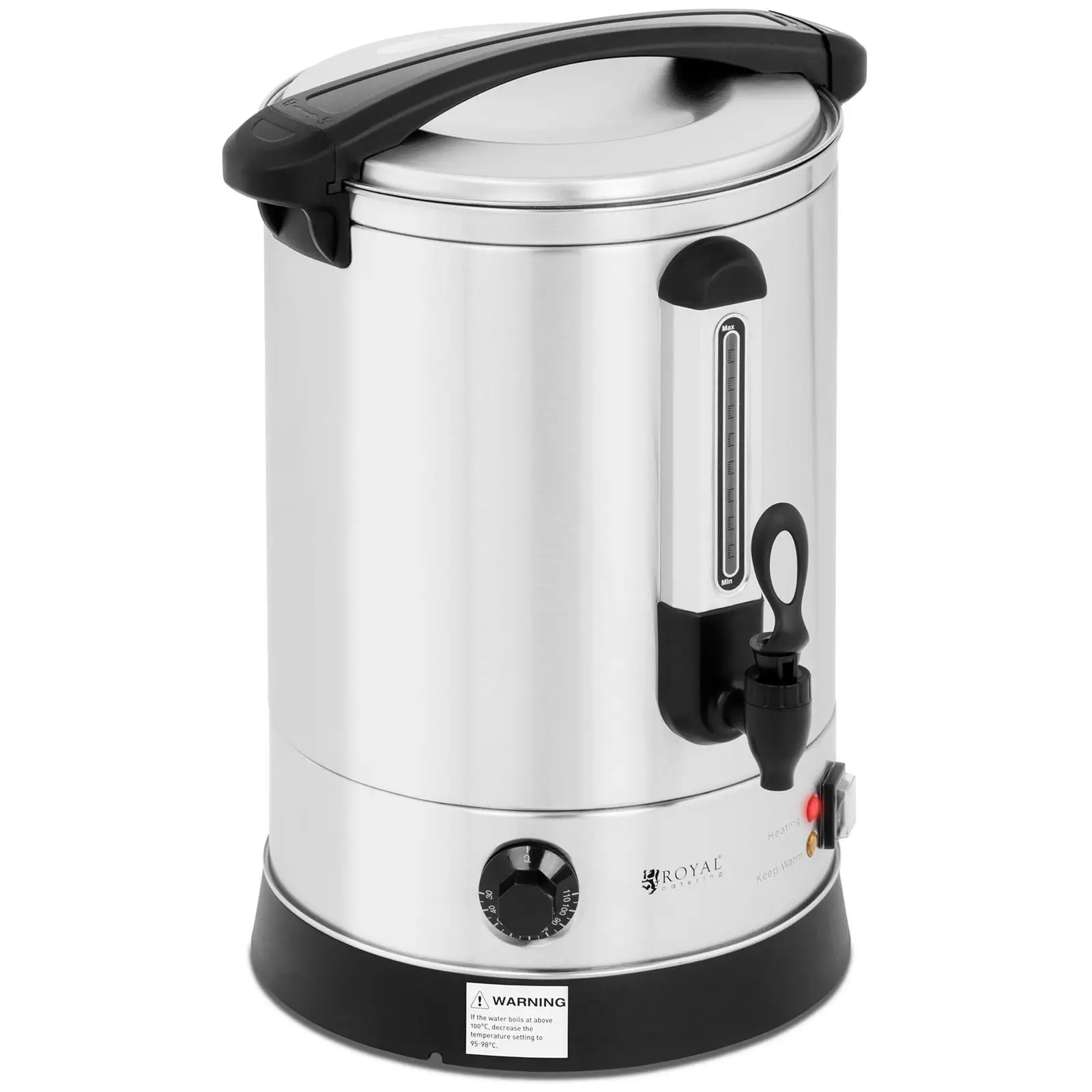 Royal Cateringin, korkealaatuisten ravintolatarvikkeiden asiantuntijoiden kuumavesiannostelija RC- WBDW14 on ihanteellinen apulainen monenlaisten kuumien juomien lämpimänäpitoon ja kuumentamiseen. Kaksiseinäinen vedenkeitin on 14,5 litran tilavuudellaan ihanteellinen käytettäväksi ravintoloissa, hotelleissa ja ruokaloissa sekä messuilla, festivaaleilla tai joulumarkkinoilla. Tähän vedenkeittimeen sisäänrakennettu tarkkuustermostaatti lämmittää juomat nopeasti 30 – 110 °C:n lämpötilaan 2500 W:n tehon ansiosta. Tätä lämpötila-aluetta voidaan säätää jatkuvasti kiertosäätimellä. Käytännöllisen lämpimänäpitotoiminnon ansiosta sisältö on aina käyttövalmis säätökiertimellä valitussa lämpötilassa. Kaksi merkkivaloa osoittavat kuumentamisen tai lämpimänäpidon tilan. Näyttöikkunan avulla näet aina, milloin keitintä on täytettävä avaamatta säiliötä. Ja jos et juuri halua kuumaa vettä, lämmitä vaikka kahvia, kaakaota, teetä tai glögiä keittimessä. Kaksiseinämäinen rakenne osoittautuu erityisen energiatehokkaaksi eristeensä vuoksi. Toinen etu: Kaksoisseinän ansiosta kylmät juomat pysyvät kylminä sisällä ja ne voidaan myös jakaa tarkasti annosteluhanalla. Ruostumattomasta teräksestä valmistetun kattilan kyljissä on lämpöeristetyt kahvat, jotta et polta sormiasi. Tukeva kansi voidaan nostaa myös riskittömästi leveällä kahvalla – näin et joudu kosketuksiin kotelon kanssa. Vedenkeitin voidaan täyttää muutamassa sekunnissa suuren aukon kautta ja lukita uudelleen ilmatiiviisti lukitusmekanismin ansiosta. Jos vedenlämmitin lämpenee liian kuumaksi, ylikuumenemissuoja kytkee laitteen automaattisesti pois päältä. Käytetyt materiaalit, kuten elintarviketurvallinen ruostumaton teräs, ovat paitsi hyvin hygieenisiä ja kestäviä, myös erittäin helppohoitoisia. Valitse nyt Royal Cateringin kuumien juomien annostelija – kaikki muu on kuin kylmää kahvia!