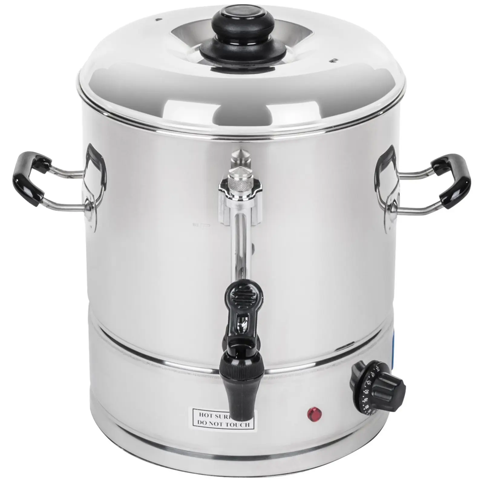 Royal Cateringin ammattimainen kuumavesiannostelija RCWK 30L tarjoaa sinulle ja asiakkaillesi jatkuvaa lämmitystä tehokkaan lämmitystehonsa ansiosta sekä kuumien juomien, kuten teen, kahvin, mutta myös alkoholijuomien, kuten glögin ja oluen ,kätevän valmistuksen. Tämä teekeitin soveltuu optimaalisesti erityisesti hotelleiden, catering-yritysten ja ravintoloiden käyttöön, mutta sitä voidaan myös käyttää muissa tiloissa. 3000 watin lämmitystehollaan ja 30 litran kokonaiskapasiteetillaan vakuuttaa RCWK 30L: n juoma-annostelija tehokkuudellaan sekä kutsuvalla ja modernilla ulkomuodollaan, joka on tervetullut näky jokaisessa buffettipöydässä. Annostelijan tilavuus on 21 litraa, mikä tarkoittaa, että nestettä voidaan kuumentaa kerralla noin 210 kuppia varten. Nykyaikaista lämmitintä voidaan käyttää säätimellä ja vesi voidaan lämmittää 30 – 100 ° C. Kuuma vesi valuu varmasti vuotamattomasta hanasta vain kun käytät sitä. Sisäänrakennettu ylikuumenemissuoja sammuttaa laitteen automaattisesti ylikuumenemisen tapahtuessa, mikä tekee siitä erityisen turvallisen. Royal Catering sähköinen glögikeitin on valmistettu kokonaan ruostumattomasta teräksestä ja on siksi paitsi helppo puhdistaa, myös tehokkaasti korroosiolta suojattu. Käytännöllinen veden tason näyttö varmistaa, että tiedät aina tarkalleen kuinka paljon vettä laitteessa on. Tämän avulla voit arvioida tarkalleen, milloin kuumavesisäiliö tulee täyttää uudelleen. Täyttäessäsi annostelijaa kansi suojaa sinua palovammoilta kuumuutta kestävällä nupilla. Laite on helposti liikuteltavissa sen kevyen, 4,25 kg: n painon ja 230 voltin jännitteen ansiosta. Siksi tuotetta voidaan käyttää missä tahansa, missä on pistorasia. Lisäksi laitteen sivuilla olevat ergonomiset kahvat takaavat helpon kuljetuksen.