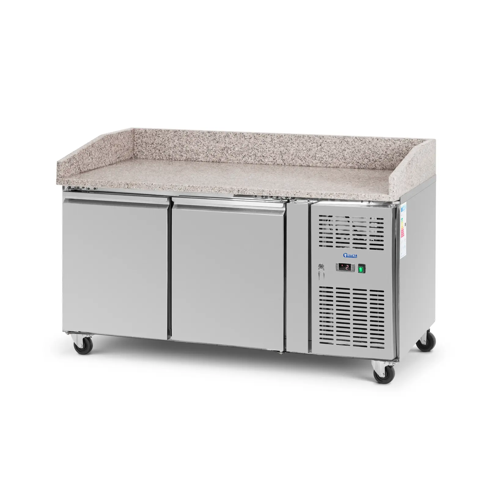 Royal Cateringin kylmäpöytä tekee tuoreiden ruokien käsittelystä tehokasta ja nopeaa. Suuri 390 litran tilavuus on yksi tämän mallin tärkeimmistä eduista. Lisäksi graniitista valmistetun työtason alla on kaksi tilavaa jäähdytyslokeroa, jotka voit jakaa korkeussäädettävillä hyllyillä. Kahden saranoidun oven sulava avaus- ja sulkumekanismi helpottaa niiden käsittelyä ravintoloiden hektisessä arjessa myös silloin, kun kätesi eivät ole vapaina. Kylmälaatikoston lämpötila-alue on 2 – 8 °C. Voit valita haluamasi lämpötilan intuitiiviselta elektroniselta näytöltä, jolta voit myös tarkistaa ajantasaisen lämpötilan. Jäähdytyspöydän avulla voit säilyttää tuotteet oikeassa lämpötilassa tai valmistella niitä suoraan 155 x 80 cm:n kokoisella graniittityötasolla. Tämä malli toimii erittäin energiatehokkaasti paksun eristyksen ja ympäristöystävällisen R290-kylmäaineen ansiosta. Kylmätiski on lukittava. Lisäksi se sisältää automaattisen sulatustoiminnon, joka vähentää energiakustannuksia ja työaikaa. Tiski tekee myös vaikutuksen energiatehokkuusluokalla B. Tämä ammattimainen kylmälaite sisältää neljä vankkarakenteista pyörää, jotka rullaavat sujuvasti myös epätasaisilla pinnoilla. Kahdella seisontajarrulla voit lukita pyörät heti, kun kylmätiski on haluamassasi paikassa. Sen kotelo on valmistettu korkealaatuisesta ruostumattomasta teräksestä. Materiaali on biologisesti inerttiä, eikä siten reagoi joutuessaan kosketuksiin ruokien kanssa, mikä tekee siitä elintarviketurvallisen valinnan. Lisäksi se on erityisen helppohoitoinen, pitkäikäinen ja korroosionkestävä materiaali.